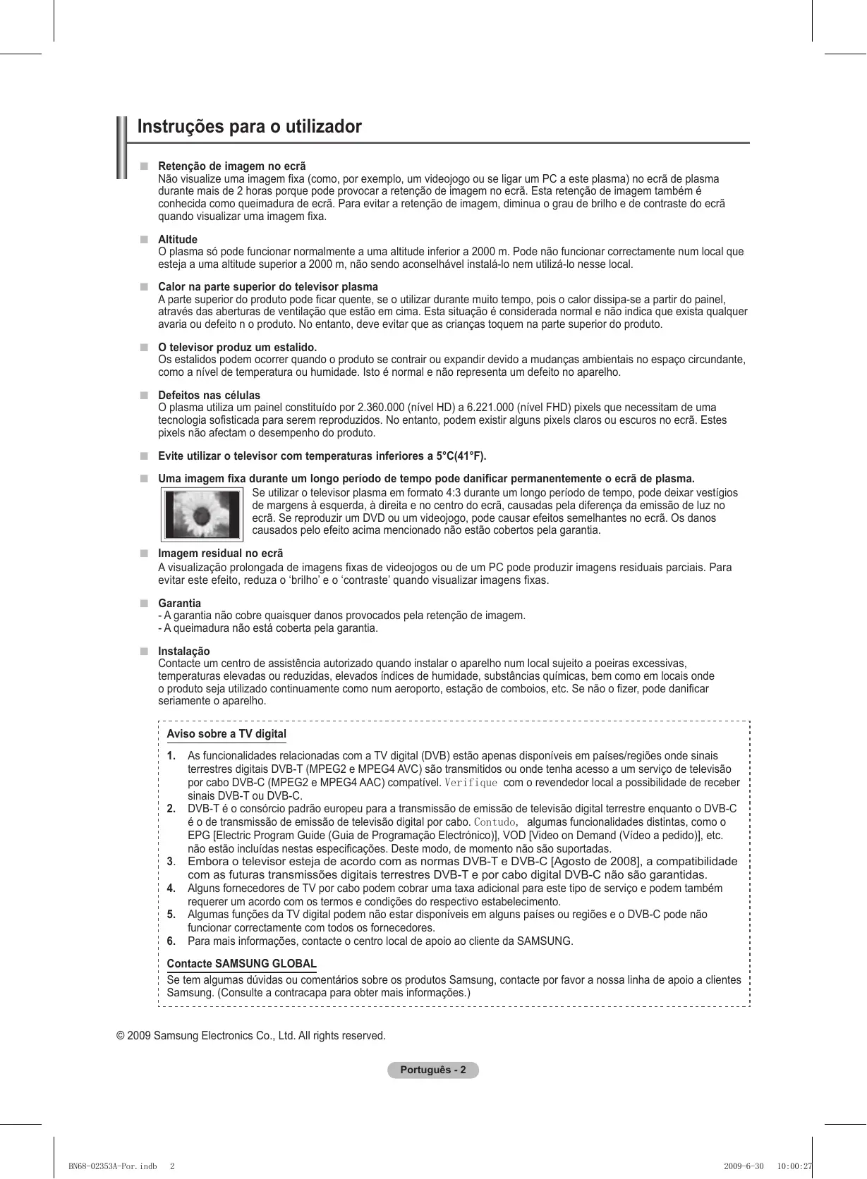 2009-6-30 9:49:18 Instruções para o utilizador Retenção de imagem no ecrã Não visualize uma imagem fixa (como, por exemplo, um videojogo ou se ligar um PC a este plasma) no ecrã de plasma durante mais de 2 horas porque pode provocar a retenção de imagem no ecrã. Esta retenção de imagem também é conhecida como queimadura de ecrã. Para evitar a retenção de imagem, diminua o grau de brilho e de contraste do ecrã quando visualizar uma imagem fixa. Altitude O plasma só pode funcionar normalmente a uma altitude inferior a 2000 m. Pode não funcionar correctamente num local que esteja a uma altitude superior a 2000 m, não sendo aconselhável instalá-lo nem utilizá-lo nesse local. Calor na parte superior do televisor plasma A parte superior do produto pode ficar quente, se o utilizar durante muito tempo, pois o calor dissipa-se a partir do painel, através das aberturas de ventilação que estão em cima. Esta situação é considerada normal e não indica que exista qualquer avaria ou defeito n o produto. No entanto, deve evitar que as crianças toquem na parte superior do produto. O televisor produz um estalido. Os estalidos podem ocorrer quando o produto se contrair ou expandir devido a mudanças ambientais no espaço circundante, como a nível de temperatura ou humidade. Isto é normal e não representa um defeito no aparelho. Defeitos nas células O plasma utiliza um painel constituído por 2.360.000 (nível HD) a 6.221.000 (nível FHD) pixels que necessitam de uma tecnologia sofisticada para serem reproduzidos. No entanto, podem existir alguns pixels claros ou escuros no ecrã. Estes pixels não afectam o desempenho do produto. Evite utilizar o televisor com temperaturas inferiores a 5°C(41°F). Uma imagem fixa durante um longo período de tempo pode danificar permanentemente o ecrã de plasma. Se utilizar o televisor plasma em formato 4:3 durante um longo período de tempo, pode deixar vestígios de margens à esquerda, à direita e no centro do ecrã, causadas pela diferença da emissão de luz no ecrã. Se reproduzir um DVD ou um videojogo, pode causar efeitos semelhantes no ecrã. Os danos causados pelo efeito acima mencionado não estão cobertos pela garantia. Imagem residual no ecrã A visualização prolongada de imagens fixas de videojogos ou de um PC pode produzir imagens residuais parciais. Para evitar este efeito, reduza o ‘brilho’ e o ‘contraste’ quando visualizar imagens fixas. Garantia - A garantia não cobre quaisquer danos provocados pela retenção de imagem. - A queimadura não está coberta pela garantia. Instalação Contacte um centro de assistência autorizado quando instalar o aparelho num local sujeito a poeiras excessivas, temperaturas elevadas ou reduzidas, elevados índices de humidade, substâncias químicas, bem como em locais onde o produto seja utilizado continuamente como num aeroporto, estação de comboios, etc. Se não o fizer, pode danificar seriamente o aparelho. Aviso sobre a TV digital