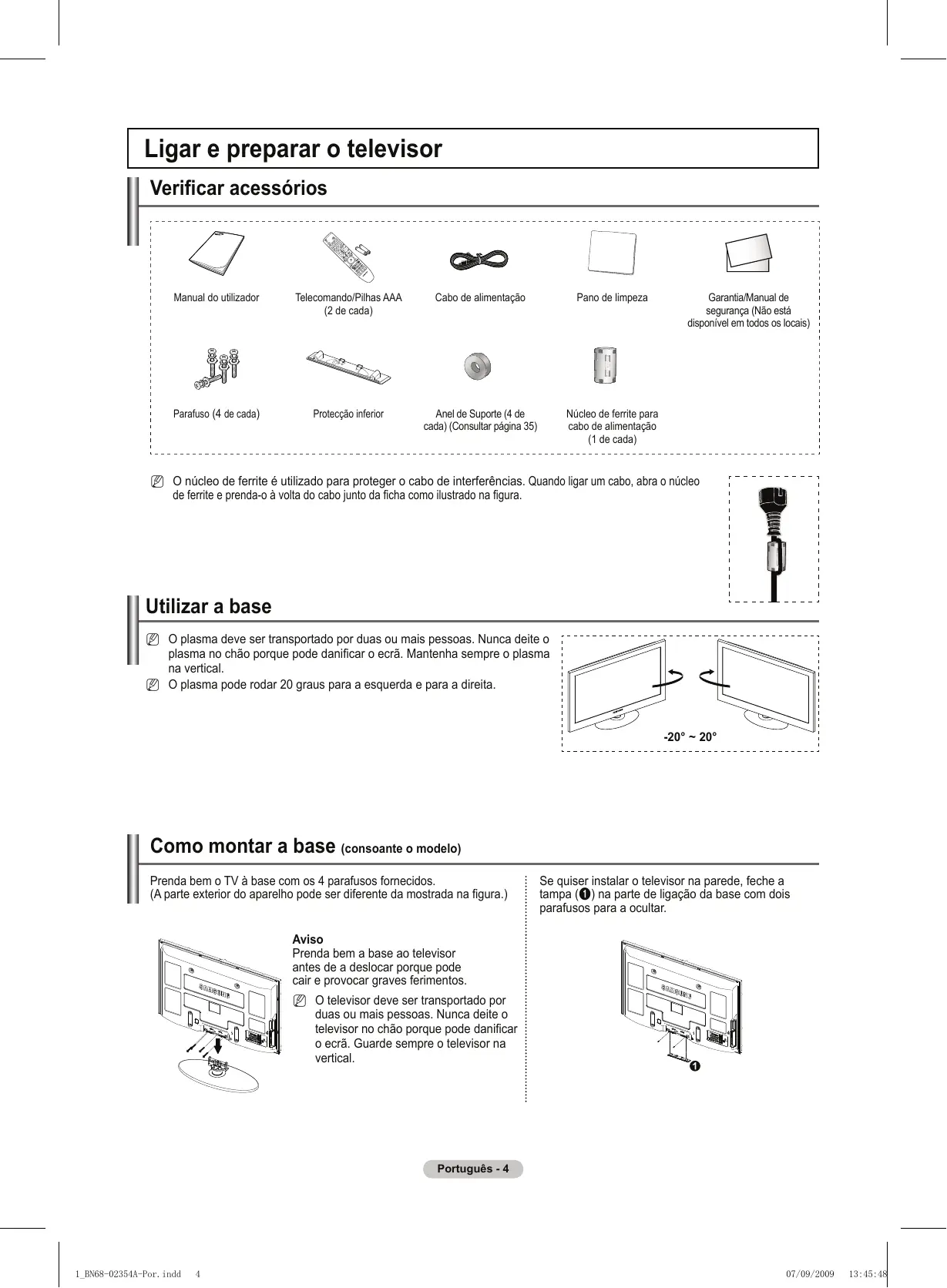 03/09/2009 15:37:33 Ligar e preparar o televisor Verificar acessórios Manual do utilizador Telecomando/Pilhas AAA (2 de cada) Cabo de alimentação Pano de limpeza Parafuso (4 de cada) Protecção inferior Anel de Suporte (4 de cada) (Consultar página 35) Núcleo de ferrite para cabo de alimentação (1 de cada) Garantia/Manual de segurança (Não está disponível em todos os locais) N O núcleo de ferrite é utilizado para proteger o cabo de interferências. Quando ligar um cabo, abra o núcleo de ferrite e prenda-o à volta do cabo junto da ficha como ilustrado na figura. Utilizar a base N O plasma deve ser transportado por duas ou mais pessoas. Nunca deite o plasma no chão porque pode danificar o ecrã. Mantenha sempre o plasma na vertical. N O plasma pode rodar 20 graus para a esquerda e para a direita. -20° ~ 20° Como montar a base (consoante o modelo) Prenda bem o TV à base com os 4 parafusos fornecidos. (A parte exterior do aparelho pode ser diferente da mostrada na figura.) Se quiser instalar o televisor na parede, feche a tampa (1) na parte de ligação da base com dois parafusos para a ocultar. Aviso Prenda bem a base ao televisor antes de a deslocar porque pode cair e provocar graves ferimentos. N O televisor deve ser transportado por duas ou mais pessoas. Nunca deite o televisor no chão porque pode danificar o ecrã. Guarde sempre o televisor na vertical. Português - 1_BN68-02354A-Por.indd