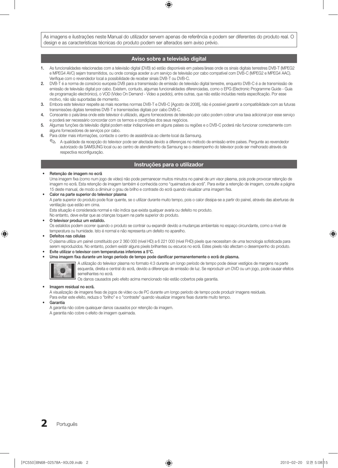 Español [PC550]BN68-02578A-X0L09.indb 50 2010-02-20 오전 5:08:15 This page is intentionally left blank. [PC550]BN68-02578A-X0L09.indb 51 2010-02-20 오전 5:08:15 As imagens e ilustrações neste Manual do utilizador servem apenas de referência e podem ser diferentes do produto real. O design e as características técnicas do produto podem ser alterados sem aviso prévio. Aviso sobre a televisão digital