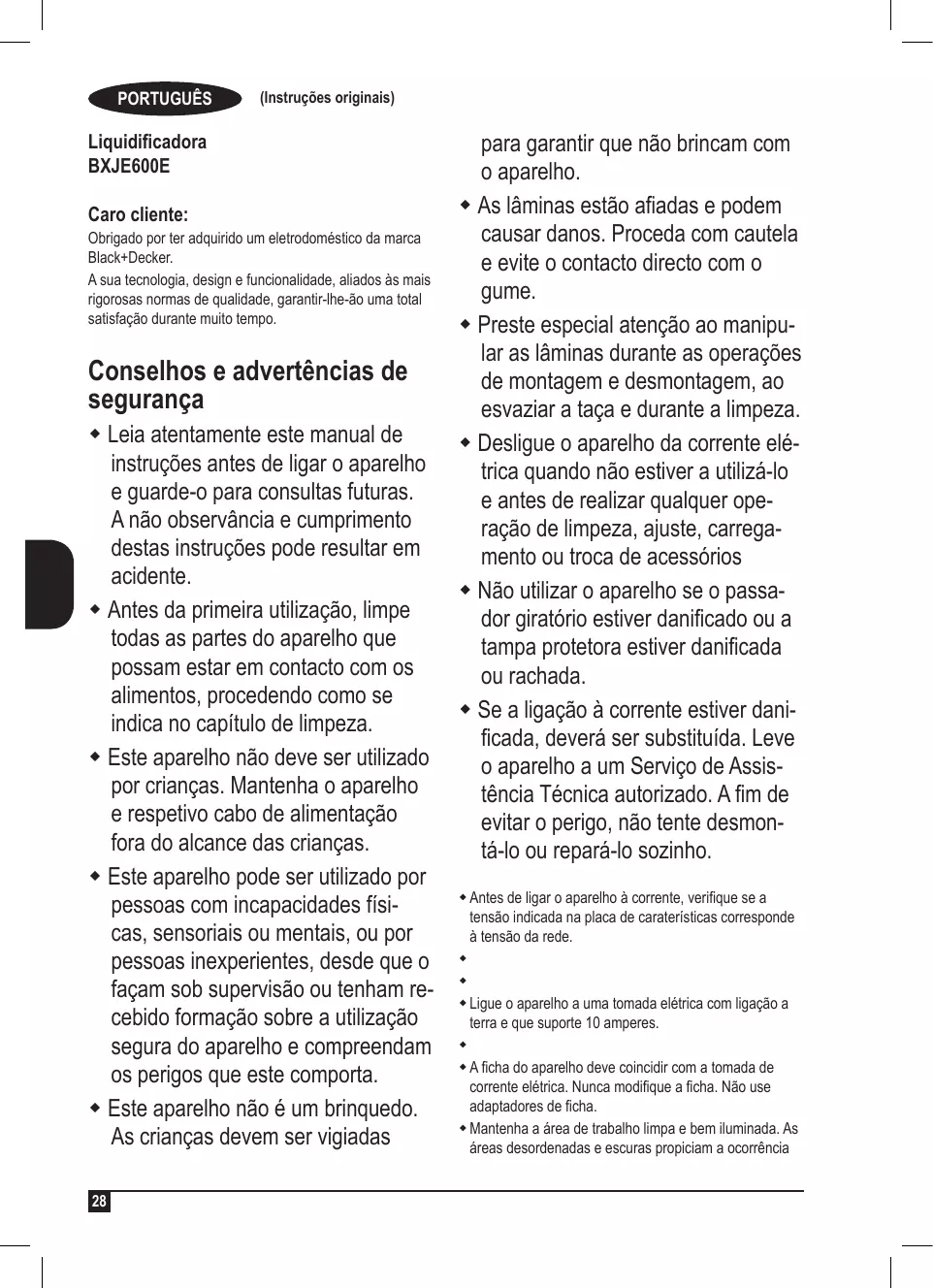 PORTUGUÊS (Instruções originais) Liquidificadora BXJE600E Caro cliente: Obrigado por ter adquirido um eletrodoméstico da marca Black+Decker. A sua tecnologia, design e funcionalidade, aliados às mais rigorosas normas de qualidade, garantir-lhe-ão uma total satisfação durante muito tempo. Conselhos e advertências de segurança Leia atentamente este manual de instruções antes de ligar o aparelho e guarde-o para consultas futuras. A não observância e cumprimento destas instruções pode resultar em acidente. Antes da primeira utilização, limpe todas as partes do aparelho que possam estar em contacto com os alimentos, procedendo como se indica no capítulo de limpeza. Este aparelho não deve ser utilizado por crianças. Mantenha o aparelho e respetivo cabo de alimentação fora do alcance das crianças. Este aparelho pode ser utilizado por pessoas com incapacidades físicas, sensoriais ou mentais, ou por pessoas inexperientes, desde que o façam sob supervisão ou tenham recebido formação sobre a utilização segura do aparelho e compreendam os perigos que este comporta. Este aparelho não é um brinquedo. As crianças devem ser vigiadas