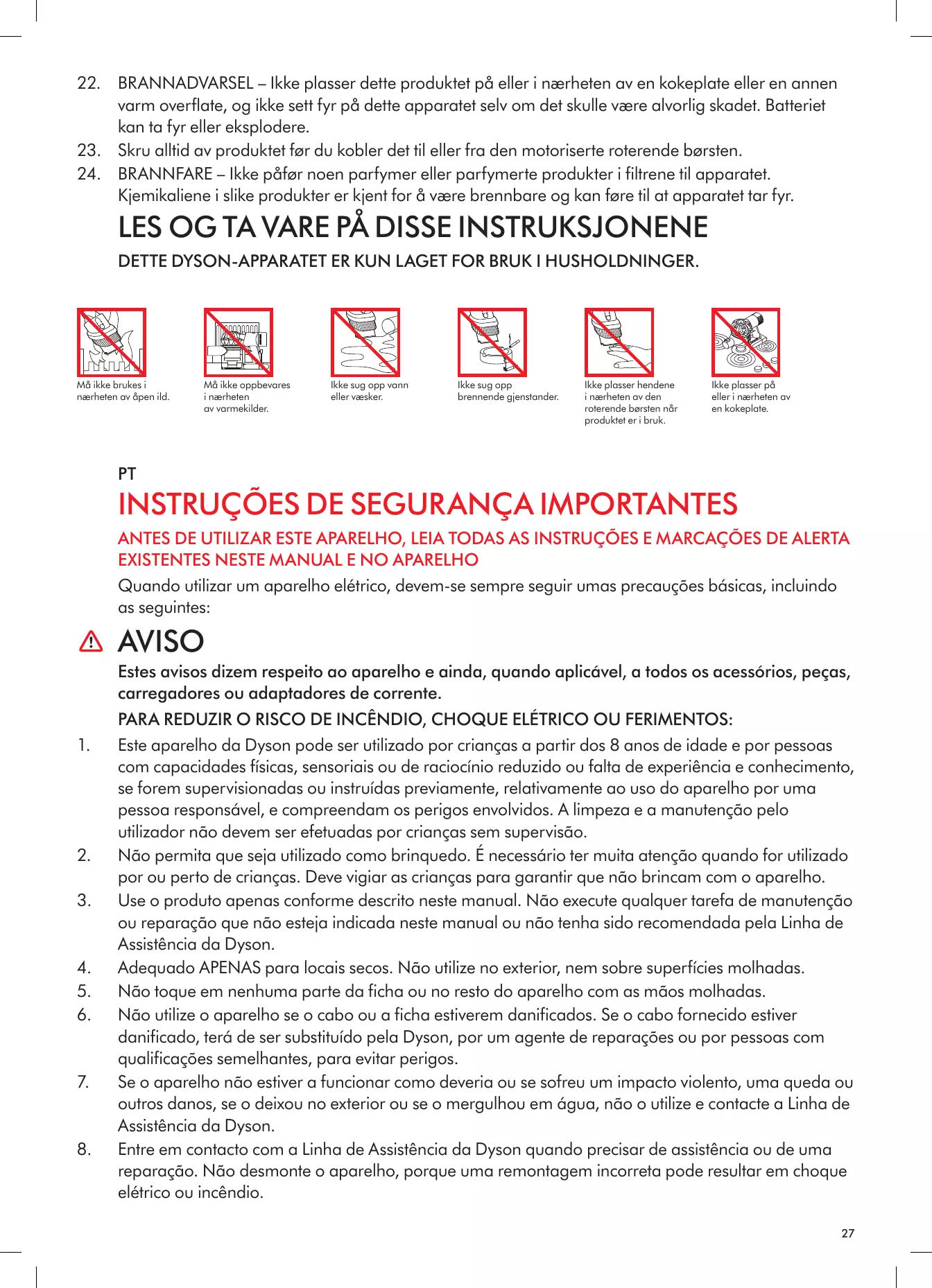 5. N’utilisez pas l’appareil si la prise ou le cordon est endommagé. Si le cordon d’alimentation est endommagé, il doit être remplacé par Dyson, par l'une des personnes agréées afin d’éviter tout danger. Si l’appareil ne fonctionne pas correctement, a reçu un choc violent, est tombé, a été endommagé, été entreposé dehors ou a été immergé dans l’eau, ne l’utilisez pas et contactez le Service consommateurs Dyson. Contactez le service consommateurs Dyson si votre appareil Dyson nécessite un entretien ou une réparation. Ne démontez pas l’appareil car un remontage incorrect risque d’entraîner un choc électrique ou un incendie. N’étirez pas le câble et n’exercez pas de tension dessus. Maintenez le câble à l’écart des surfaces chauffées. Ne fermez pas de porte sur le câble et ne tirez pas sur le câble lorsqu’il se trouve à proximité d’angles ou de coins. Maintenez le câble à l’écart des zones de passage, à un endroit où personne n’est susceptible de marcher ou de trébucher dessus. Ne faites pas rouler l’appareil sur le câble. Ne débranchez pas en tirant sur le câble d’alimentation. Pour débrancher, saisissez la prise et non le câble. L’utilisation d’une rallonge n’est pas recommandée. N’utilisez pas l’appareil pour aspirer de l’eau. N’utilisez pas l’appareil pour aspirer des liquides inflammables ou combustibles comme l’essence, ou dans des endroits où un liquide de ce type pourrait être présent. N’aspirez rien qui brule ou qui fume, comme des cigarettes, des allumettes ou des cendres incandescentes. Éloignez les cheveux, les vêtements amples, les doigts et toute autre partie du corps des ouvertures et des pièces mobiles de l’appareil, notamment de la brosse rotative. Ne dirigez pas le flexible, le tube ou les accessoires vers les yeux ou les oreilles et ne les portez pas à la bouche. Ne placez pas d’objets dans les ouvertures de l’appareil. N'utilisez pas l’appareil en cas d’obstruction d’une ouverture. Assurez-vous que rien ne réduit le flux d’air : poussières, peluches, cheveux ou autres. N’utilisez que les accessoires et pièces de rechange recommandés par Dyson. N’utilisez pas l’appareil si le collecteur transparent et les filtres ne sont pas en place. Débranchez l’appareil lorsqu’il n’est pas utilisé pendant une période prolongée et avant tout entretien ou nettoyage. Redoublez de prudence lors de l’utilisation dans les escaliers. N’installez pas, ne rechargez pas et n’utilisez pas cet appareil à l’extérieur, dans une salle de bains ou à moins de 3 mètres d’une piscine. Ne l’utilisez pas sur une surface humide et ne l’exposez pas à l’humidité, la pluie ou la neige. Utilisez uniquement des chargeurs Dyson pour recharger cet appareil. Utilisez uniquement des batteries Dyson : les autres types de batteries peuvent exploser et provoquer des blessures et des dommages. RISQUE D’INCENDIE – Ne placez pas ce produit sur (ou à proximité) d’une cuisinière ou autre surface et ne l’incinérez pas même s’il est fortement endommagé. La batterie risque de prendre feu ou d’exploser. Éteignez toujours l’appareil avant de brancher ou de débrancher la brosse motorisée. RISQUE D’INCENDIE – N’appliquez pas de parfum ou de produit parfumé sur le(s) filtre(s) de cet appareil. Les substances chimiques contenues dans ces produits sont connues pour leur caractère inflammable et peuvent enflammer l’appareil.