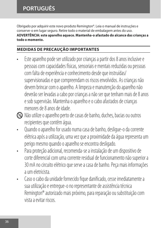 • Este aparelho pode ser utilizado por crianças a partir dos 8 anos inclusive e pessoas com capacidades físicas, sensoriais e mentais reduzidas ou pessoas com falta de experiência e conhecimento desde que instruídas/ supervisionadas e que compreendam os riscos envolvidos. As crianças não devem brincar com o aparelho. A limpeza e manutenção do aparelho não deverão ser levadas a cabo por crianças a não ser que tenham mais de 8 anos e sob supervisão. Mantenha o aparelho e o cabo afastados de crianças menores de 8 anos de idade. L Não utilize o aparelho perto de casas de banho, duches, bacias ou outros recipientes que contêm água. • Quando o aparelho for usado numa casa de banho, desligue-o da corrente elétrica após a utilização, uma vez que a proximidade da água representa um perigo mesmo quando o aparelho se encontra desligado. • Para proteção adicional, recomenda-se a instalação de um dispositivo de corte diferencial com uma corrente residual de funcionamento não superior a 30 mA no circuito elétrico que serve a casa de banho. Peça mais informações a um eletricista. • Caso o cabo da unidade fornecido fique danificado, cesse imediatamente a sua utilização e entregue-o no representante de assistência técnica Remington® autorizado mais próximo, para reparação ou substituição com vista a evitar riscos. 36