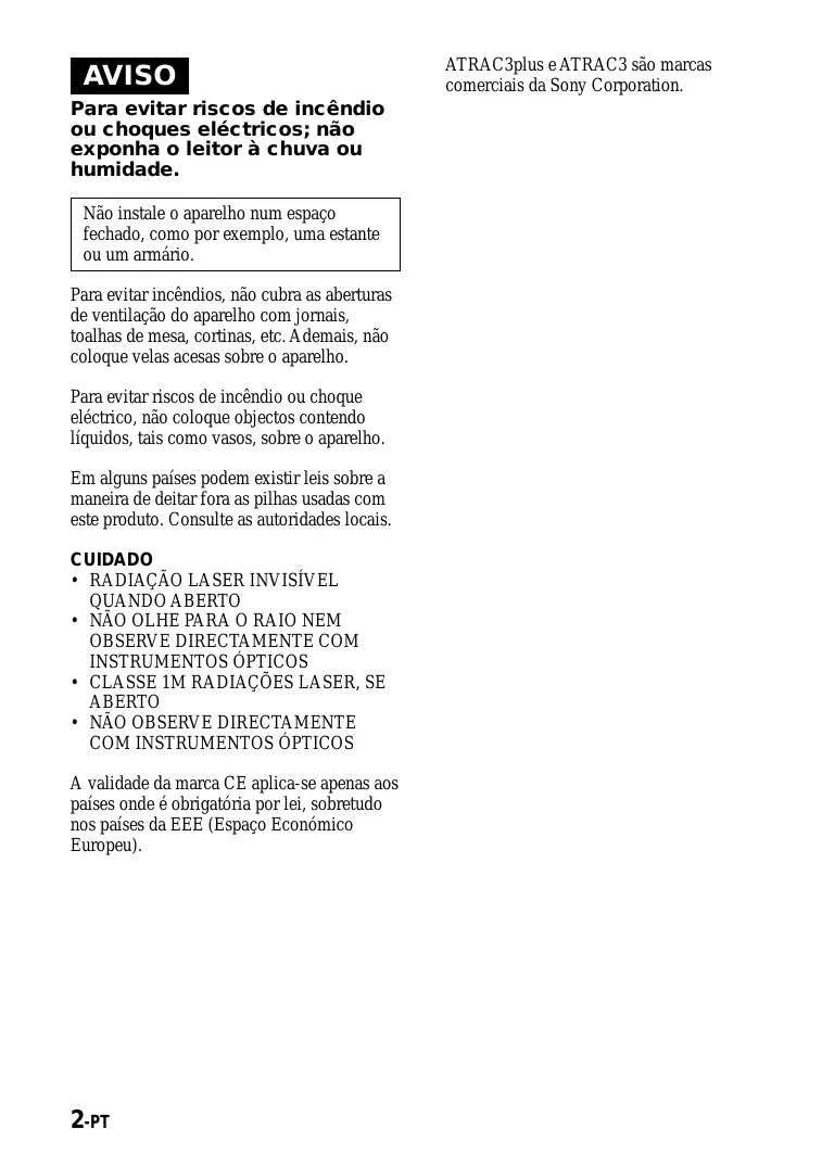 • A validade da marca CE aplica-se apenas aos países onde é obrigatória por lei, sobretudo nos países da EEE (Espaço Económico Europeu). 2-PT ATRAC3plus e ATRAC3 são marcas comerciais da Sony Corporation. Índice Divirta-se com o CD Walkman ATRAC ! Fontes de música que pode reproduzir neste leitor de CD p. 6