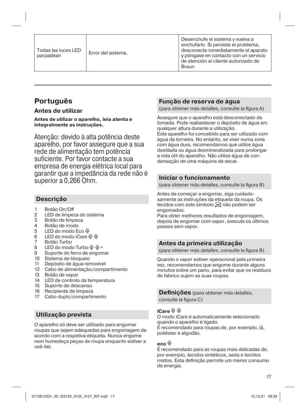 Desconete o sistema da tomada e volte a ligar. Se o problema persistir, desconecte o aparelho da tomada imediatamente e contacte um Centro de Assistência ao Cliente Braun autorizado
