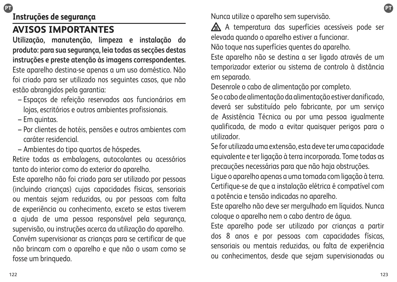 – en entornos tipo casas de huéspedes. Retirar todo el material de embalaje, así como los adhesivos y elementos de protección presentes tanto en el interior como en el exterior del aparato. No se ha previsto el uso de este aparato por parte de personas (incluidos niños) cuyas capacidades físicas, sensoriales o mentales sean reducidas, ni personas que no tengan la experiencia y el conocimiento necesarios, salvo si estas personas reciben, a través de una persona responsable de su seguridad, vigilancia o instrucciones previas sobre el uso seguro del aparato. 82