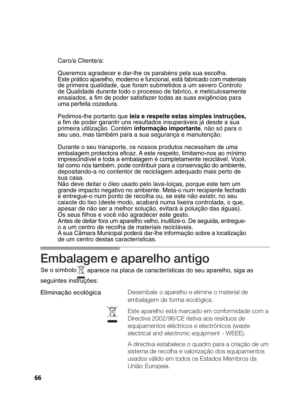 Queremos agradecer e dar-lhe os parabéns pela sua escolha. Este pratico aparelho, moderno e funcional, está fabricado com materiais de primeira qualidade, que foram submetidos a um severo Controlo de Qualidade durante todo o processo de fabricio, e meticulosamente ensaiados, a fim de poder satisfazer todas as suas exigências para uma perfeita cozedura.