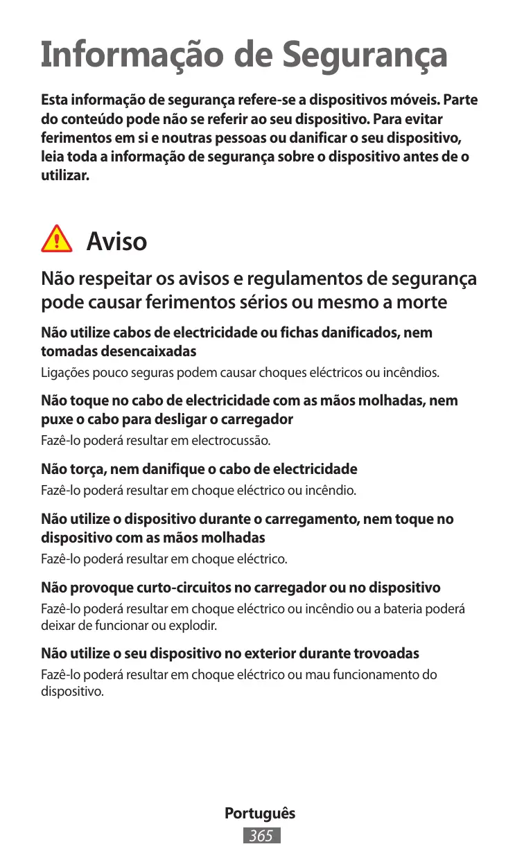 Informação de Segurança Esta informação de segurança refere-se a dispositivos móveis. Parte do conteúdo pode não se referir ao seu dispositivo. Para evitar ferimentos em si e noutras pessoas ou danificar o seu dispositivo, leia toda a informação de segurança sobre o dispositivo antes de o utilizar. Aviso Não respeitar os avisos e regulamentos de segurança pode causar ferimentos sérios ou mesmo a morte Não utilize cabos de electricidade ou fichas danificados, nem tomadas desencaixadas Ligações pouco seguras podem causar choques eléctricos ou incêndios. Não toque no cabo de electricidade com as mãos molhadas, nem puxe o cabo para desligar o carregador Fazê-lo poderá resultar em electrocussão. Não torça, nem danifique o cabo de electricidade Fazê-lo poderá resultar em choque eléctrico ou incêndio. Não utilize o dispositivo durante o carregamento, nem toque no dispositivo com as mãos molhadas Fazê-lo poderá resultar em choque eléctrico. Não provoque curto-circuitos no carregador ou no dispositivo Fazê-lo poderá resultar em choque eléctrico ou incêndio ou a bateria poderá deixar de funcionar ou explodir. Não utilize o seu dispositivo no exterior durante trovoadas Fazê-lo poderá resultar em choque eléctrico ou mau funcionamento do dispositivo. Português