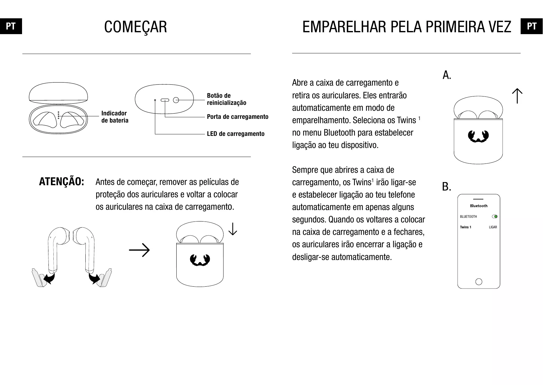 Bluetooth para que se conecten a tu dispositivo. La próxima vez que abras el estuche de carga, tus Twins1 se encenderán automáticamente y se conectarán a tu teléfono en cuestión de segundos. Cuando vuelvas a colocar los auriculares y cierres el estuche de carga, se desconectarán y apagarán automáticamente.