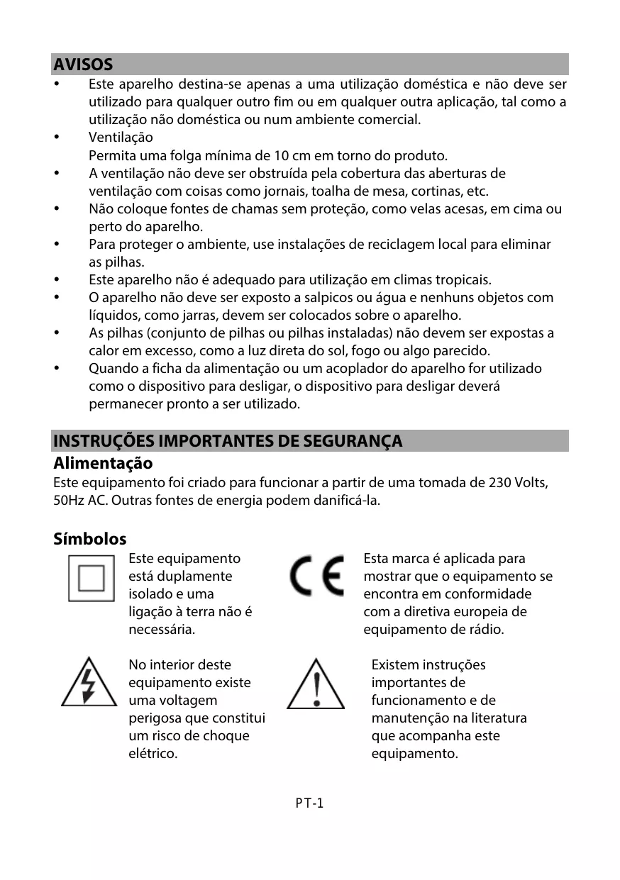 Il convient de ne pas placer sur l’appareil de sources de flammes nues, telles que des bougies allumées. Déposez vos piles usagées auprès d'installation de recyclage pour protéger notre environnement. Cet appareil n'est pas destiné à être utilisé sous un climat tropical. L’appareil ne doit pas être exposé á des égouttements d'eau ou des éclaboussures et de plus qu'aucun objet rempli de liquide tel que des vases ne doit être placé sur l’ appareil. Les piles (piles installées) ne doivent pas être exposées à une chaleur excessive telle que celle du soleil, d'un feu ou d'origine similaire. Lorsque la prise du réseau d'alimentation ou une prise placée sur l’appareil est utilise comme dispositif de déconnexion, ce dispositif doit demeure aisément accessible.