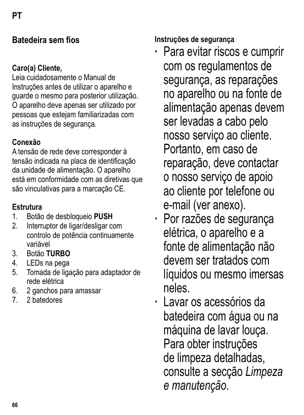 Branchement au secteur La tension du réseau doit correspondre à la tension indiquée sur la plaque signalétique du bloc d’alimentation. L’appareil est conforme aux directives obligatoires pour le marquage CE. Familiarisez-vous avec votre appareil 1. Bouton de déclenchement PUSH 2. Interrupteur marche/arrêt avec réglage de la puissance en continu 3. Touche TURBO 4. Voyants DEL sur la poignée 5. Prise de raccordement pour l’adaptateur du bloc d’alimentation 6. 2 crochets à pâte 7. 2 fouets Consignes de sécurité importantes