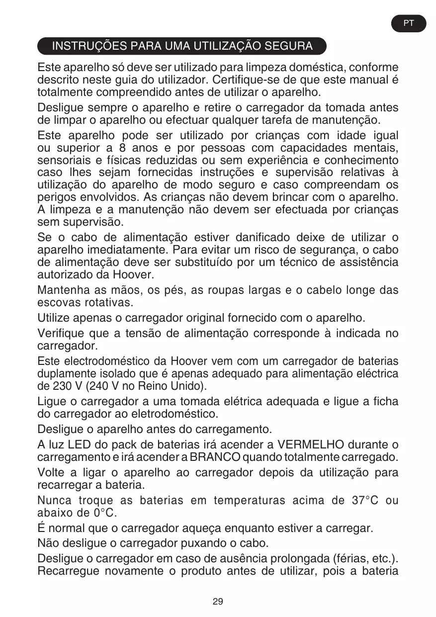 Le nettoyage et l’entretien ne devraient pas être effectués par des enfants sans supervision. Si le cordon d’alimentation est endommagé, arrêtez immédiatement d’utiliser l’appareil. Pour éviter les risques d’accident, un réparateur Hoover agréé doit remplacer le cordon d’alimentation. Maintenez les mains, pieds, vêtements et cheveux à distance des brosses rotatives. Utilisez uniquement le chargeur d’origine qui vous a été fourni avec l’appareil. Vérifiez que la tension de l’alimentation est la même que celle indiquée sur le chargeur. Cet appreil Hoover est fourni avec un chargeur de batterie doublement isolé qui n’est adapté qu’à une prise de 230 V (240 V Grande-Bretagne). Branchez le chargeur dans une prise adaptée et connectez la prise jack du chargeur dans l’appareil. Éteignez l’appareil avant de le charger. Le voyant LED du bloc batterie s’illumine en ROUGE lors de la charge et deviendra BLANC lorsque l’appareil est entièrement chargé. Rebranchez l’appareil au chargeur après l’utilisation pour recharger les batteries. Ne rechargez jamais les batteries dans des températures de plus de 37°C ou en-dessous de 0°C. Il est normal pour le chargeur de devenir chaud au toucher lorsqu’il est en train de charger. Ne pas débrancher en tirant sur le cordon d’alimentation. Débranchez le chargeur en cas d’absence prolongée (vacances, etc.). Rechargez l’appareil de nouveau avant de l’utiliser car les 8