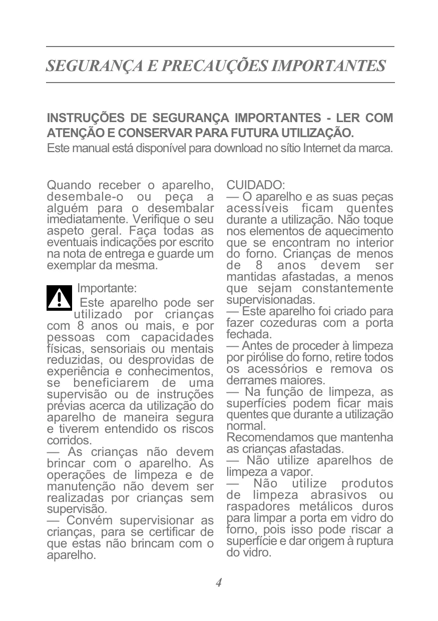 Cet appareil peut être utilisé par des enfants âgés de 8 ans et plus, et par des personnes aux capacités physiques, sensorielles ou mentales réduites, ou dénuées d’expérience et de connaissance, si elles ont pu bénéficier d’une surveillance ou d’instructions préalables concernant l’utilisation de l’appareil de façon sûre et en ont compris les risques encourus. — Les enfants ne doivent pas jouer avec l’appareil. Les opérations de nettoyage et de maintenance ne doivent pas être faites par des enfants laissés sans surveillance. — Il convient de surveiller les enfants pour s’assurer qu’ils ne jouent pas avec l’appareil. 4
