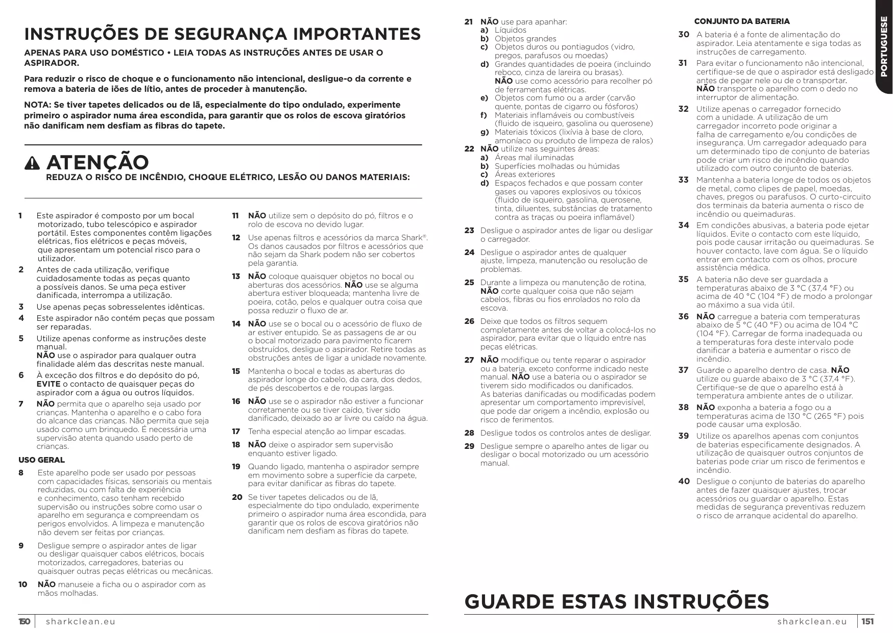 ¿Qué cubre la garantía gratuita Shark®? La reparación o sustitución de su batería Shark® (queda a discreción del fabricante si se debe sustituir o reparar), incluidas todas las piezas y la mano de obra. La garantía Shark® es adicional a sus derechos legales como consumidor. ¿Qué aspectos no cubre la garantía gratuita Shark®? 1. D esgaste normal de las piezas que requieren un mantenimiento o una sustitución regulares para asegurar el funcionamiento adecuado de la unidad. 2. D años accidentales y fallos debidos a uso o mantenimiento incorrecto, descuido, maniobras imprudentes o manipulación de la batería que no respete lo indicado en las instrucciones de Shark® suministradas con el aparato. 3. U so de la batería para cualquier propósito distinto al de alimentar la aspiradora Shark® con la que se entrega. 4. M ontaje de componentes o accesorios en contradicción con las instrucciones. 5. U so de piezas o accesorios que no sean originales de Shark®. 6. Instalación incorrecta (salvo que la haya efectuado Shark®). ¿Dónde puedo adquirir baterías Shark® originales? Las baterías Shark® están diseñadas por los mismos ingenieros que desarrollan las aspiradoras Shark®. Encontrará una gama completa de baterías de repuesto para todos los aparatos Shark® en www.Sharkclean.eu. Recuerde que la garantía no cubre los daños causados por el uso de baterías que no sean originales Shark®. No obstante, sus derechos legales no se verán afectados.