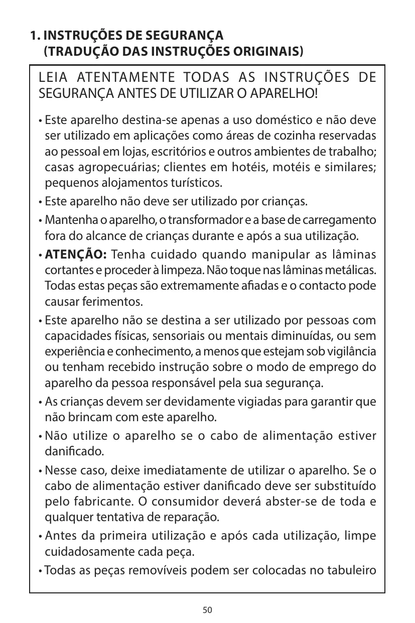 LEIA ATENTAMENTE TODAS AS INSTRUÇÕES DE SEGURANÇA ANTES DE UTILIZAR O APARELHO! • Este aparelho destina-se apenas a uso doméstico e não deve ser utilizado em aplicações como áreas de cozinha reservadas ao pessoal em lojas, escritórios e outros ambientes de trabalho; casas agropecuárias; clientes em hotéis, motéis e similares; pequenos alojamentos turísticos. • Este aparelho não deve ser utilizado por crianças. • Mantenha o aparelho, o transformador e a base de carregamento fora do alcance de crianças durante e após a sua utilização. • ATENÇÃO: Tenha cuidado quando manipular as lâminas cortantes e proceder à limpeza. Não toque nas lâminas metálicas. Todas estas peças são extremamente afiadas e o contacto pode causar ferimentos. • Este aparelho não se destina a ser utilizado por pessoas com capacidades físicas, sensoriais ou mentais diminuídas, ou sem experiência e conhecimento, a menos que estejam sob vigilância ou tenham recebido instrução sobre o modo de emprego do aparelho da pessoa responsável pela sua segurança. • As crianças devem ser devidamente vigiadas para garantir que não brincam com este aparelho. • Não utilize o aparelho se o cabo de alimentação estiver danificado. • Nesse caso, deixe imediatamente de utilizar o aparelho. Se o cabo de alimentação estiver danificado deve ser substituído pelo fabricante. O consumidor deverá abster-se de toda e qualquer tentativa de reparação. • Antes da primeira utilização e após cada utilização, limpe cuidadosamente cada peça. • Todas as peças removíveis podem ser colocadas no tabuleiro 50