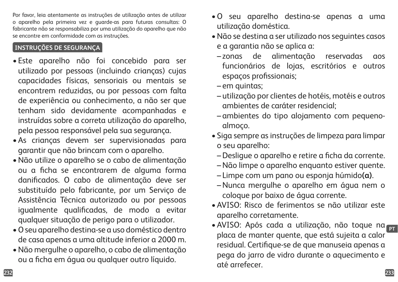 • Ne laissez pas les enfants jouer avec l'appareil. • N'utilisez pas l'appareil si la prise ou le câble d'alimentation est endommagé. Le câble d'alimentation doit être remplacé par le fabricant, son service après-vente ou des personnes de qualifications similaires pour éviter tout danger. • Votre appareil est destiné uniquement à un usage domestique et à l'intérieur de la maison, à une altitude inférieure à 2 000 m. • N'immergez pas l'appareil, le câble d'alimentation ou la fiche dans l'eau ou tout autre liquide. • Cet appareil est conçu pour un usage domestique seulement.