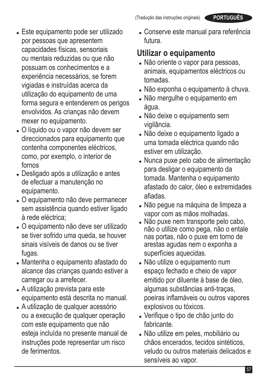 PORTUGUÊS O líquido ou o vapor não devem ser apontados para equipamento que contenha componentes eléctricos, como, por exemplo, o interior de fornos. u O equipamento não deve permanecer sem assistência quando estiver ligado à rede eléctrica. u O equipamento não deve ser utilizado se tiver sofrido uma queda, se houver sinais visíveis de danos ou se tiver fugas. u Mantenha o equipamento afastado do alcance das crianças quando estiver a carregar ou a arrefecer. u Deve ter cuidado quando utilizar o equipamento devido à emissão de vapor. u Desligue o equipamento durante o enchimento e a limpeza. u O equipamento não deve permanecer sem assistência quando estiver ligado à rede eléctrica. u mantenha o equipamento e o respectivo cabo afastados do alcance de crianças com menos de 8 anos quando estiver energizado ou tiver arrefecido. u