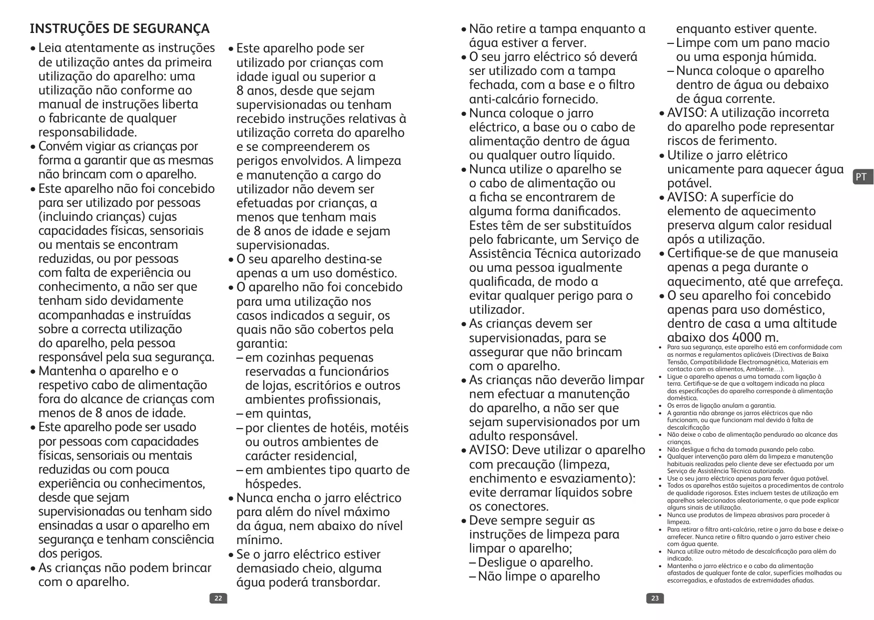 • Si la bouilloire est trop remplie, de l’eau bouillante peut être éjectée. • N’ouvrez pas le couvercle lorsque l’eau bout. • Votre bouilloire ne doit être utilisée qu’avec le couvercle verrouillé, le socle et le filtre anti-tartre qui lui sont associés. • Ne mettez pas l’appareil, le socle, le câble d’alimentation ou la fiche dans l’eau ou tout autre liquide. • N’utilisez pas la bouilloire si le câble d’alimentation ou la fiche sont endommagés. Faites les obligatoirement remplacer par le fabricant, son service après-vente ou des personnes de qualification similaire afin d’éviter tout danger. • Il convient de surveiller les enfants pour s’assurer qu’ils ne jouent pas avec l’appareil. • Le nettoyage et l’entretien par l’usager ne doivent pas être effectués par des enfants sans surveillance. • AVERTISSEMENT: Soyez prudent lors de la manipulation de votre appareil (nettoyage, remplissage et versage) : éviter tout débordement de liquide sur les connecteurs. • Toujours suivre les instructions de nettoyage pour nettoyer votre appareil; 4