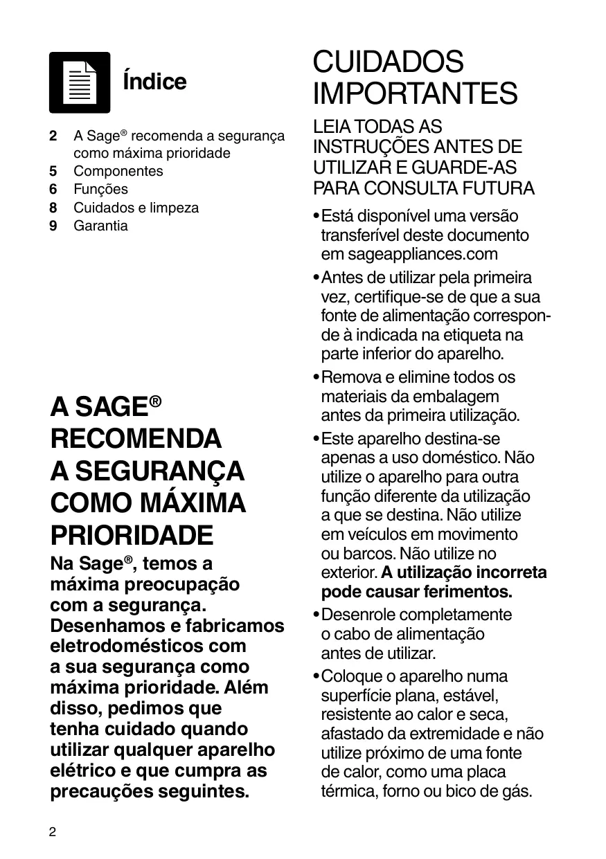 Na Sage®, temos a maior preocupaçao com a segurar. Desenhamos e fabricamos eletrodomesticos com a sua segurar como maior prioridade. Além disso, pedimos que tenha cuidado quando utilizes qualquer aparelho elétrico e que cumpra as precauções seguales.