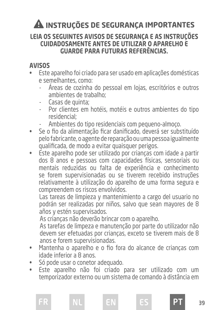 As tarefas de limpeza e manutençao por parte do'utilizar não devem ser efetuadas por crianças, exceto se tiverem mais de 8 anos e foram supervisionadas.