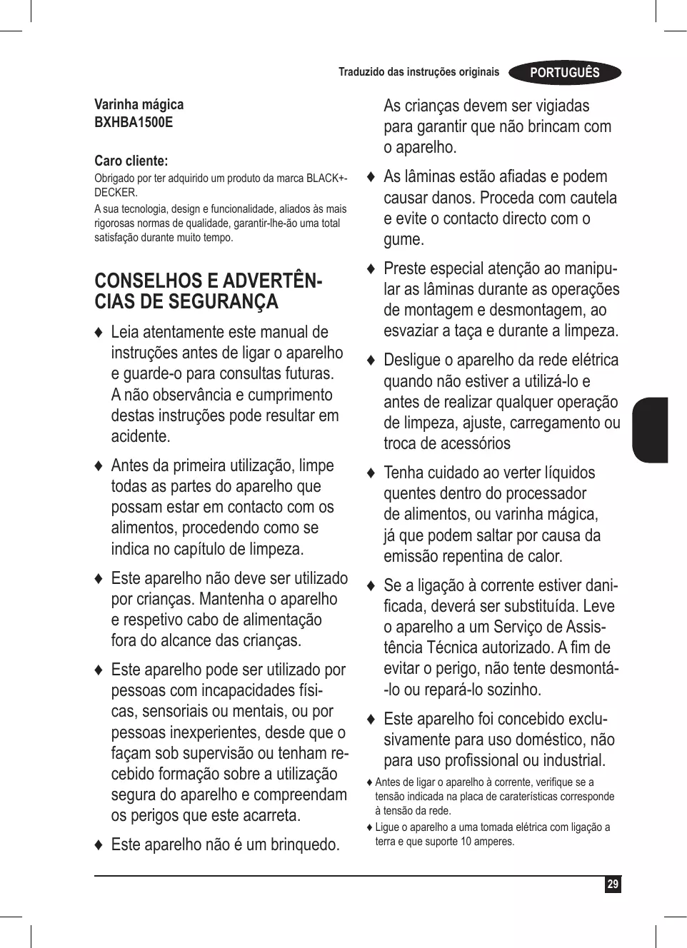 Traduzido das instruções originais Varinha mágica BXHBA1500E Caro cliente: Obrigado por ter adquirido um produto da marca BLACK+DECKER. A sua tecnologia, design e funcionalidade, aliados às mais rigorosas normas de qualidade, garantir-lhe-ão uma total satisfação durante muito tempo. CONSELHOS E ADVERTÊNCIAS DE SEGURANÇA ♦♦ Leia atentamente este manual de instruções antes de ligar o aparelho e guarde-o para consultas futuras. A não observância e cumprimento destas instruções pode resultar em acidente. ♦♦ Antes da primeira utilização, limpe todas as partes do aparelho que possam estar em contacto com os alimentos, procedendo como se indica no capítulo de limpeza. ♦♦ Este aparelho não deve ser utilizado por crianças. Mantenha o aparelho e respetivo cabo de alimentação fora do alcance das crianças. ♦♦ Este aparelho pode ser utilizado por pessoas com incapacidades físicas, sensoriais ou mentais, ou por pessoas inexperientes, desde que o façam sob supervisão ou tenham recebido formação sobre a utilização segura do aparelho e compreendam os perigos que este acarreta. ♦♦ Este aparelho não é um brinquedo. PORTUGUÊS As crianças devem ser vigiadas para garantir que não brincam com o aparelho. ♦♦ As lâminas estão afiadas e podem causar danos. Proceda com cautela e evite o contacto directo com o gume. ♦♦ Preste especial atenção ao manipular as lâminas durante as operações de montagem e desmontagem, ao esvaziar a taça e durante a limpeza. ♦♦ Desligue o aparelho da rede elétrica quando não estiver a utilizá-lo e antes de realizar qualquer operação de limpeza, ajuste, carregamento ou troca de acessórios ♦♦ Tenha cuidado ao verter líquidos quentes dentro do processador de alimentos, ou varinha mágica, já que podem saltar por causa da emissão repentina de calor. ♦♦ Se a ligação à corrente estiver danificada, deverá ser substituída. Leve o aparelho a um Serviço de Assistência Técnica autorizado. A fim de evitar o perigo, não tente desmontá-lo ou repará-lo sozinho. ♦♦ Este aparelho foi concebido exclusivamente para uso doméstico, não para uso profissional ou industrial. ♦♦Antes de ligar o aparelho à corrente, verifique se a tensão indicada na placa de caraterísticas corresponde à tensão da rede. ♦♦Ligue o aparelho a uma tomada elétrica com ligação a terra e que suporte 10 amperes.