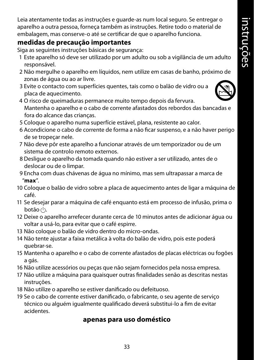 3 Ne touchez pas les surfaces chaudes ( la carafe, la plaque chauffante). 4 Le risque de brûlure persiste longtemps après ébullition. Tenez l’appareil et le câble loin des bords des surfaces de travail et hors de portée des enfants. 5 Posez l’appareil sur une surface stable, à niveau et résistante à la chaleur. 6 Branchez le cordon de sorte qu’il ne pende pas et qu’il n’y ait aucun risque de trébucher dessus. 7 Cet appareil ne doit pas être utilisé avec un minuteur externe ou un système de contrôle à distance. 8 Débranchez l’appareil lorsque vous ne l’utilisez pas, avant de le déplacer et avant de le nettoyer. 9 Remplissez le réservoir avec 2 tasses au minimum, mais sans dépasser la marque max. 10 Placez la carafe sur la plaque chauffante avant d’allumer la cafetière. 11 Si vous voulez arrêter la machine pendant la préparation du café, appuyez sur le bouton 2. 12 Laissez l’appareil refroidir au moins 10 minutes avant de rajouter de l’eau ou de le réutiliser afin d’éviter toute projection. 13 Ne mettez pas la carafe au four micro-ondes. 14 N’essayez pas de régler la bande métallique autour de la carafe, le verre casserait. 15 Placez l’appareil et le cordon loin des plaques chauffantes, des plans de cuisson ou des brûleurs. 16 N’adaptez pas d’accessoires autres que ceux fournis. 17 N’utilisez pas l’appareil à d’autres fins que celles décrites dans ce mode d’emploi. 18 N’utilisez pas l’appareil s’il est endommagé ou s’il ne fonctionne pas correctement. 19 Si le câble est abîmé, vous devez le faire remplacer par le fabricant, un de ses techniciens agréés ou une personne également qualifiée, pour éviter tout danger.