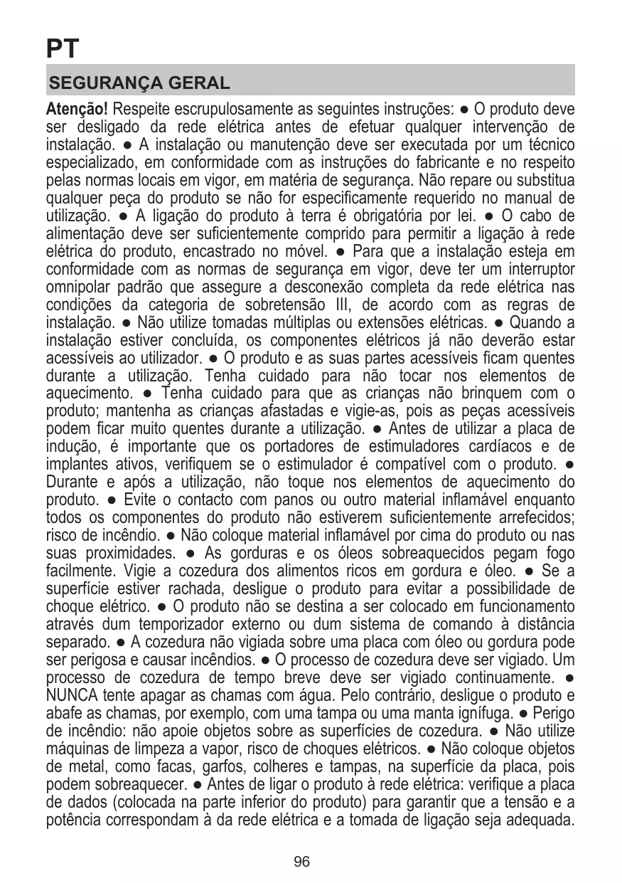 JAMAIS tenter d'éteindre les flammes avec de l'eau. Au contraire, éteindre le produit et étouffer les flammes, par exemple avec un couvercle ou une couverture anti-feu. ● Risque d'incendie : ne pas placer d'objets sur les surfaces de cuisson. ● Ne pas utiliser de nettoyeur vapeur, risque d'électrocution. ● Ne pas poser d’objets métalliques tels que des couteaux, des fourchettes, des cuillères et des couvercles sur la surface de la plaque de cuisson car ils pourraient surchauffer. ● Avant de brancher le produit au secteur électrique : contrôler la plaque des données (présente sur la partie inférieure du produit) pour vérifier que la tension 48