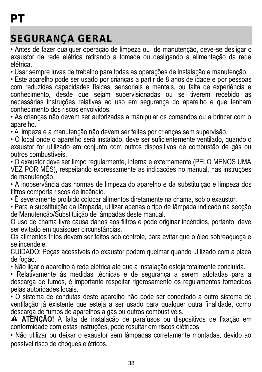 • Les enfants ne doivent pas jouer avec l’appareil. • Le nettoyage et l’entretien par l’usager ne doivent pas être effectués par des enfants sans surveillance. • La pièce doit avoir une aération suffisante lorsque la hotte est utilisée conjointement avec d'autres appareils fonctionnant au gaz ou autres combustibles. • La hotte doit être régulièrement nettoyée à la fois à l'intérieur et à l'extérieur (AU MOINS UNE FOIS PAR MOIS); cela devrait se faire en conformité avec les instructions d'entretien. Le non respect des instructions expressément fournies concernant le nettoyage de la hotte et des filtres peut provoquer des risques d'incendie. • Ne pas flamber d’aliments sous la hotte. • Pour le remplacement de la lampe, utilisez uniquement le type de lampe spécifié dans la section remplacement/maintenance lampe dans ce manuel. L'utilisation d'une flamme nue est dommageable pour les filtres et peut causer un incendie, par conséquent, il est déconseillé de l'utiliser. La friture doit être faite avec soin afin de s’assurer que l’huile surchauffée ne prenne pas feu. AVERTISSEMENT: Lorsque la table de cuisson est en fonctionnement, les parties accessibles de la hotte peuvent devenir très chaudes. • Ne pas brancher l'appareil au réseau électrique avant que l'installation ne soit complètement terminée. • En ce qui concerne les mesures techniques et de sécurité à prendre pour l'évacuation des fumées, respectez strictement les dispositions des règlements locales. • L’air ne doit pas être envoyé dans un conduit utilisé pour évacuer les fumées d’appareils utilisant du gaz ou un autre combustible. ATTENTION ! Le défaut d'installer les vis et les dispositifs de fixation conformément à ces instructions peut entraîner des risques électriques. • Ne pas utiliser ou laisser la hotte sans les lampes correctement montées, car un éventuel risque de choc électrique est possible. • N’utilisez jamais la hotte sans la grille montée correctement! • La hotte ne doit JAMAIS être utilisée comme une surface d'appui, sauf indication expresse. • Utilisez uniquement les vis de fixation fournies avec le produit pour l'installation, ou, si 17
