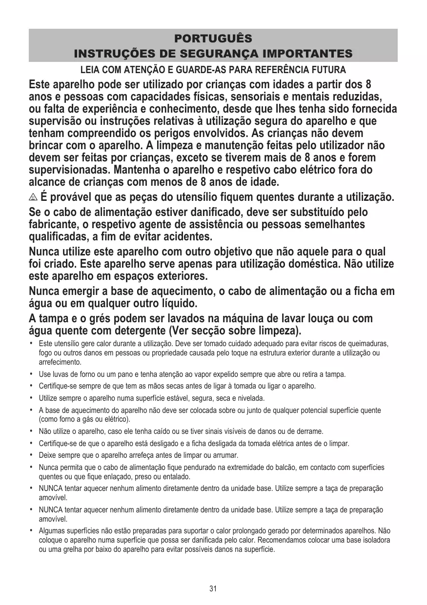N’utilisez ce produit qu’aux fins pour lesquelles il est prévu. Cet appareil est destine a etre utilise dans des applications domestiques et analogues telles que: des coins cuisines reserves au personnel dans des magasins, bureaux et autres environments professionnels; dans des fermes; l'utilisation par les clients des hotels, motels et autre environments a caractere residentiel; des environments du type chambres d'hotes.Cet appareil est conçu exclusivement pour une utilisation domestique. N’utilisez pas cet appareil à l’extérieur. Ne plongez pas la base chauffante, son cordon d’alimentation ou sa prise dans de l’eau ou tout autre liquide. Lavez le couvercle et la cocotte en grès au lave-vaisselle ou dans de l’eau chaude savonneuse (Voir section consacrée au nettoyage). • Cet appareil génère de la chaleur en cours d’utilisation. Prenez des précautions concernant la prévention des brûlures, • • • Assurez-vous que vos mains sont sèches avant de manipuler la prise ou de mettre l’appareil en marche. Utilisez toujours l’appareil sur une surface stable, sûre, sèche et horizontale. La base chauffante de cet appareil ne doit pas être placée sur ou près d’une surface potentiellement chaude (une plaque de cuisson électrique ou au gaz, par exemple). N’utilisez pas l’appareil s’il a subi un choc, ou en cas de signes visibles de dommages ou en cas de fuite. Assurez-vous que l’appareil est arrêté et débranchez-le avant de le nettoyer. Attendez toujours que l’appareil se refroidisse avant de le nettoyer ou le ranger. Ne laissez pas le cordon d’alimentation pendre dans le vide, toucher des surfaces chaudes ou s’emmêler, se bloquer ou se pincer. Ne tentez JAMAIS de réchauffer un plat directement à l’intérieur de la cuve. Utilisez toujours la cocotte amovible. Certaines surfaces ne sont pas conçues pour supporter une exposition prolongée à la chaleur générée par certains appareils. Ne placez pas l’appareil sur une surface susceptible d’être endommagée par la chaleur. Il est recommandé de placer un support résistant à la chaleur ou un dessous-de-plat sous l’appareil pour éviter d’endommager la surface. Le couvercle de la mijoteuse est en verre trempé. Avant chaque utilisation, assurez-vous qu’il n’est ni ébréché, ni fissuré et qu’il est exempt de tout autre défaut. N’utilisez pas le couvercle en verre s’il est endommagé, car il risque de se briser en cours de cuisson. 10