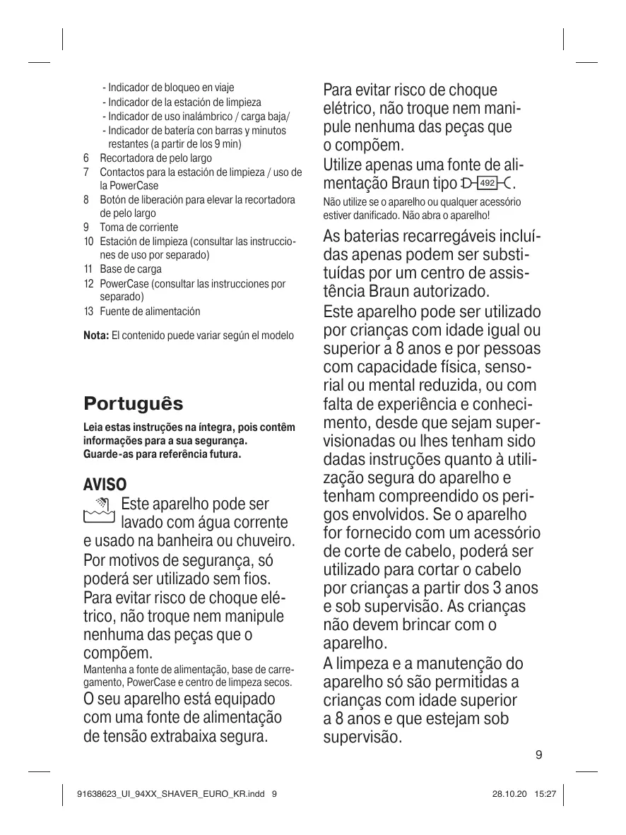 As baterias recarregáveis incluídas apenas podem ser substituídas por um centro de assistência Braun autorizado. Este aparelho pode ser utilizado por crianças com idade igual ou superior a 8 anos e por pessoas com capacidade física, sensorial ou mental reduzida, ou com falta de experiência e conhecimento, desde que sejam supervisionadas ou lhes tenham sido dadas instruções quanto à utilização segura do aparelho e tenham compreendido os perigos envolvidos. Se o aparelho for fornecido com um acessório de corte de cabelo, poderá ser utilizado para cortar o cabelo por crianças a partir dos 3 anos e sob supervisão. As crianças não devem brincar com o aparelho. A limpeza e a manutenção do aparelho só são permitidas a crianças com idade superior a 8 anos e que estejam sob supervisão. 9