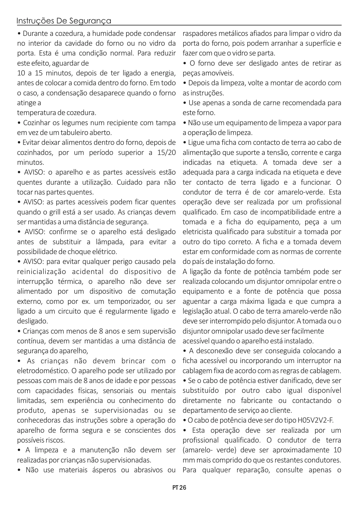 Obrigado por ter optado por um dos nossos produtos. Para tirar o maior proveito possível do seu forno, recomendamos que: Leia atentamente este manual de instruções de utilização; ele contém instruções importantes sobre a instalação, a utilização e a manutenção seguras deste forno. Mantenha este manual de instruções à mão, num local seguro, para o poder consultar sempre que necessário. Quando o forno for ligado pela primeira vez, ele poderá emitir fumo com um cheiro acre. Isto fica a dever-se ao facto de o agente aglutinante dos painéis de isolamento existentes à volta do forno ter sido aquecido pela primeira vez. Trata-se de um facto absolutamente normal; se ele ocorrer, terá apenas de esperar que o fumo se dissipe antes de introduzir os alimentos no forno. Devido à sua natureza, um forno aquece muito, em especial a sua porta de vidro.