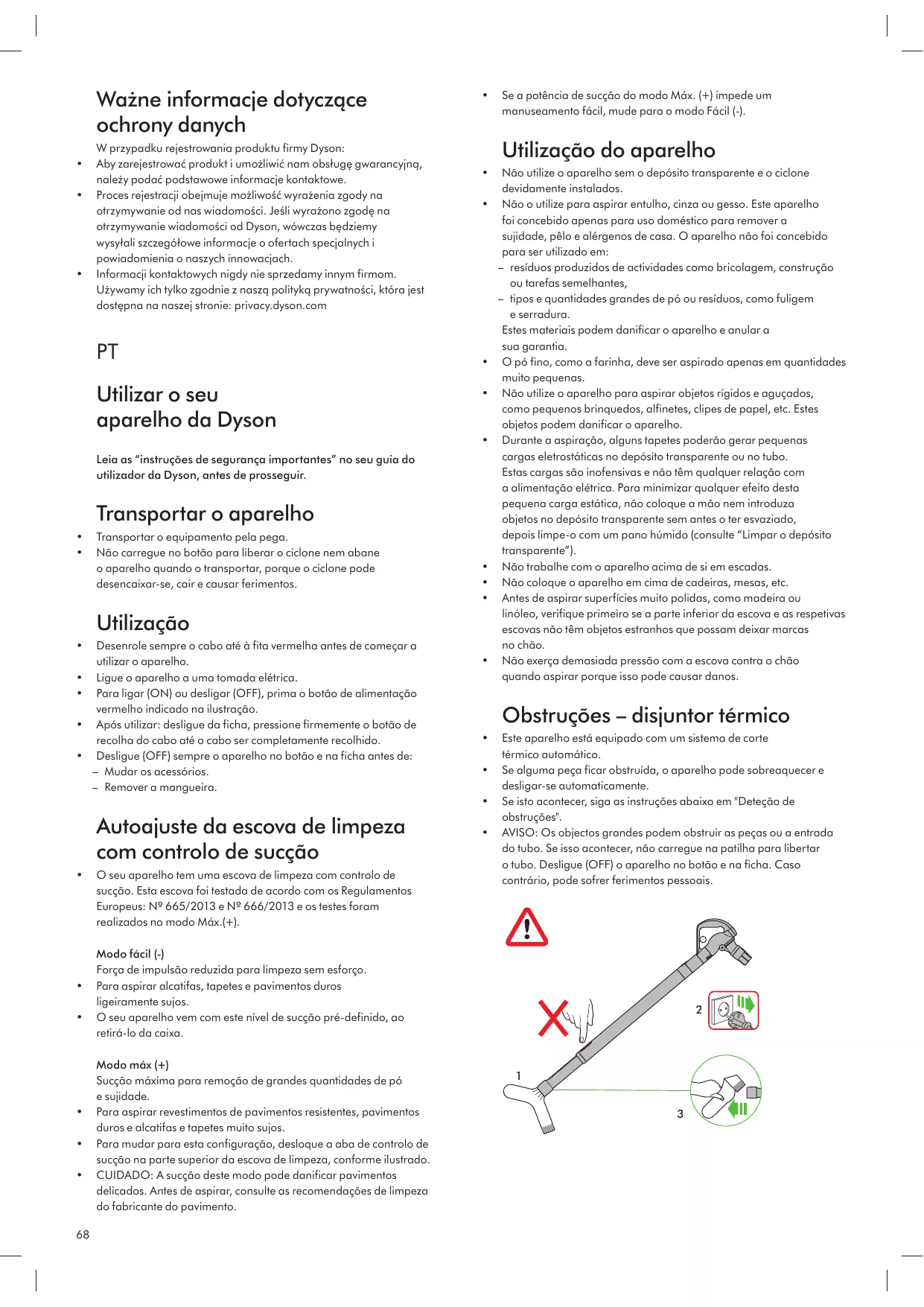 Não execute qualquer ação de manutenção ou reparação para além das indicadas no seu Guia do utilizador da Dyson ou recomendadas pela Linha de Assistência da Dyson. Utilize apenas peças recomendadas pela Dyson. Caso contrário, poderá invalidar a garantia. Guarde o aparelho em espaços interiores. Não utilize nem guarde num ambiente com temperatura abaixo de 3ºC (37,4ºF). Certifique-se de que o aparelho está à temperatura ambiente antes de o utilizar. Limpe o aparelho apenas com um pano seco. Não utilize lubrificantes, detergentes, produtos de polimento ou ambientadores em nenhuma parte do aparelho. Se utilizar o aparelho numa garagem, limpe sempre a base do acessório para pavimentos e a base do aparelho com um pano seco depois de aspirar para remover areia, lama ou pedras que possam danificar chãos mais delicados.