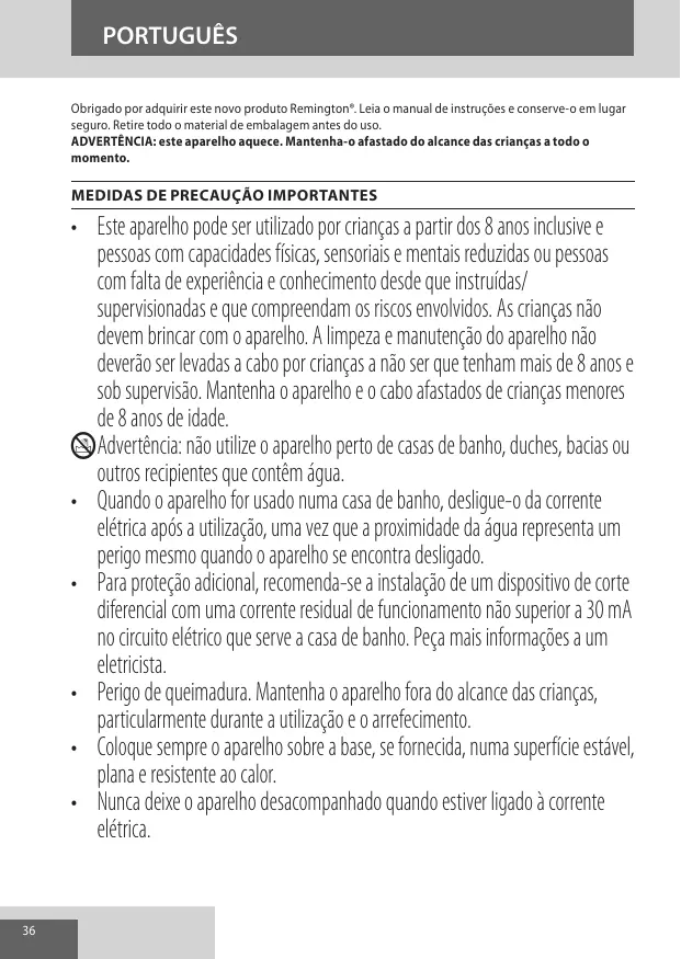 Tenez l’appareil et le câble hors de portée des enfants de moins de 8 ans. L Avertissement : Veillez à ne pas utiliser cet appareil à proximité de baignoires, douches, lavabos ou autres récipients contenant de l’eau. • Lorsque l’appareil est utilisé dans une salle de bains, débranchez-le après usage. La proximité de l’eau présente un danger même lorsque l’appareil est éteint. • Pour une protection supplémentaire, l’installation de courant résiduel (RCD)avec un differentiel residuel nominal ne dépassant pas 30mA est recommandée. Demandez de l’aide à un électricien. • Risque de brûlure. Veillez à maintenir l’appareil hors de portée des jeunes enfants, en particulier lorsque vous utilisez l’appareil et lorsqu’il refroidit. • Placez toujours l’appareil avec son support, le cas échéant, sur une surface plate, stable et résistante à la chaleur. • Ne laissez en aucun cas l’appareil sans surveillance quand il est connecté au réseau électrique. • Si le cordon d’alimentation de cet appareil est endommagé, cessez immédiatement d’utiliser l’appareil et renvoyez-le au service consommateurs Remington agréé le plus proche en vue de sa réparation ou de sa substitution afin d’éviter tout risque. 14