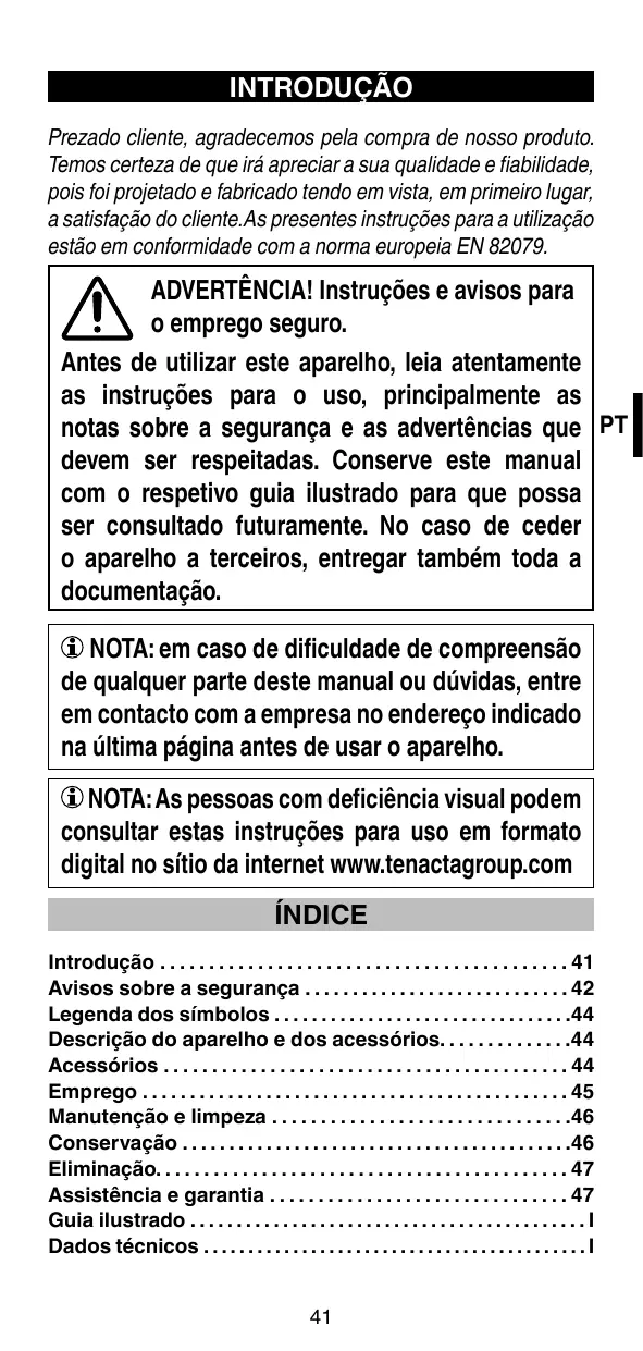 NOTA: As pessoas com deficiência visual podem consultar estas instruções para uso em formato digital no sítio da internet www.tenactagroup.com ÍNDICE Introdução . . . . . . . . . . . . . . . . . . . . . . . . . . . . . . . . . . . . . . . . . . 41 Avisos sobre a segurança . . . . . . . . . . . . . . . . . . . . . . . . . . . . 42 Legenda dos símbolos . . . . . . . . . . . . . . . . . . . . . . . . . . . . . . . .44 Descrição do aparelho e dos acessórios. . . . . . . . . . . . . .44 Acessórios . . . . . . . . . . . . . . . . . . . . . . . . . . . . . . . . . . . . . . . . . . 44 Emprego . . . . . . . . . . . . . . . . . . . . . . . . . . . . . . . . . . . . . . . . . . . . . 45 Manutenção e limpeza . . . . . . . . . . . . . . . . . . . . . . . . . . . . . . .46 Conservação . . . . . . . . . . . . . . . . . . . . . . . . . . . . . . . . . . . . . . . . . .46 Eliminação. . . . . . . . . . . . . . . . . . . . . . . . . . . . . . . . . . . . . . . . . . . 47 Assistência e garantia . . . . . . . . . . . . . . . . . . . . . . . . . . . . . . . 47 Guia ilustrado . . . . . . . . . . . . . . . . . . . . . . . . . . . . . . . . . . . . . . . . . . . I Dados técnicos . . . . . . . . . . . . . . . . . . . . . . . . . . . . . . . . . . . . . . . . . . . I 41
