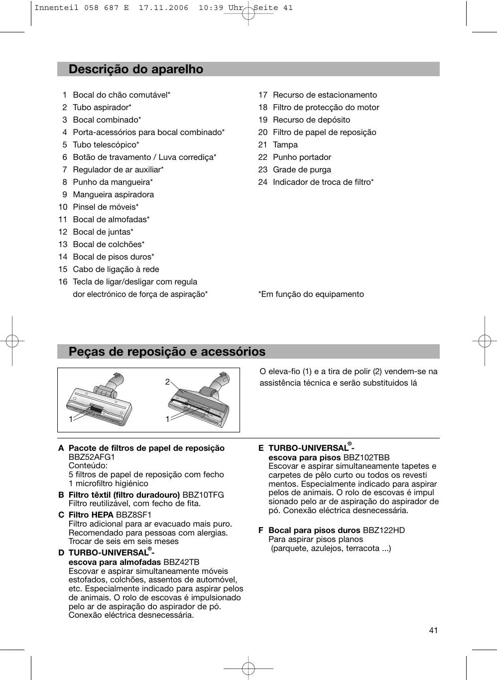 A Pacote de filtros de papel de reposição BBZ52AFG1 Conteúdo: 5 filtros de papel de reposição com fecho 1 microfiltro higiénico B Filtro têxtil (filtro duradouro) BBZ10TFG Filtro reutilizável, com fecho de fita. C Filtro HEPA BBZ8SF1 Filtro adicional para ar evacuado mais puro. Recomendado para pessoas com alergias. Trocar de seis em seis meses ® D TURBO-UNIVERSAL escova para almofadas BBZ42TB Escovar e aspirar simultaneamente móveis estofados, colchões, assentos de automóvel, etc. Especialmente indicado para aspirar pelos de animais. O rolo de escovas é impulsionado pelo ar de aspiração do aspirador de pó. Conexão eléctrica desnecessária.
