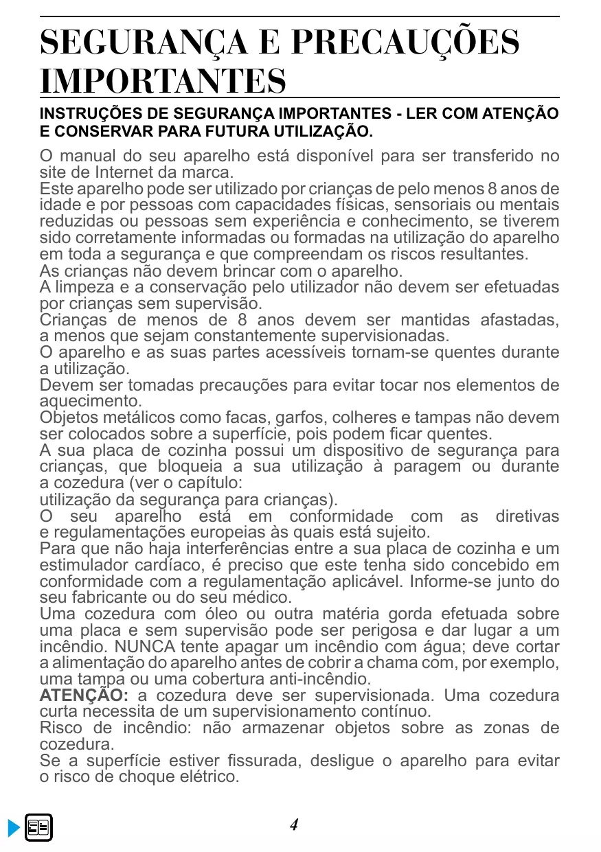 O manual do seu aparelho está disponível para ser transferido no site de Internet da marca. Este aparelho pode ser utilizado por crianças de pelo menos 8 anos de idade e por pessoas com capacidades físicas, sensoriais ou mentais reduzidas ou pessoas sem experiência e conhecimento, se tiverem sido corretamente informadas ou formadas na utilização do aparelho em toda a segurança e que compreendam os riscos resultantes. As crianças não devem brincar com o aparelho. A limpeza e a conservação pelo utilizador não devem ser efetuadas por crianças sem supervisão. Crianças de menos de 8 anos devem ser mantidas afastadas, a menos que sejam constantemente supervisionadas. O aparelho e as suas partes acessíveis tornam-se quentes durante a utilização. Devem ser tomadas precauções para evitar tocar nos elementos de aquecimento. Objetos metálicos como facas, garfos, colheres e tampas não devem ser colocados sobre a superfície, pois podem ficar quentes. A sua placa de cozinha possui um dispositivo de segurança para crianças, que bloqueia a sua utilização à paragem ou durante a cozedura (ver o capítulo: utilização da segurança para crianças). O seu aparelho está em conformidade com as diretivas e regulamentações europeias às quais está sujeito. Para que não haja interferências entre a sua placa de cozinha e um estimulador cardíaco, é preciso que este tenha sido concebido em conformidade com a regulamentação aplicável. Informe-se junto do seu fabricante ou do seu médico. Uma cozedura com óleo ou outra matéria gorda efetuada sobre uma placa e sem supervisão pode ser perigosa e dar lugar a um incêndio. NUNCA tente apagar um incêndio com água; deve cortar a alimentação do aparelho antes de cobrir a chama com, por exemplo, uma tampa ou uma cobertura anti-incêndio. ATENÇÃO: a cozedura deve ser supervisionada. Uma cozedura curta necessita de um supervisionamento contínuo. Risco de incêndio: não armazenar objetos sobre as zonas de cozedura. Se a superfície estiver fissurada, desligue o aparelho para evitar o risco de choque elétrico. 4
