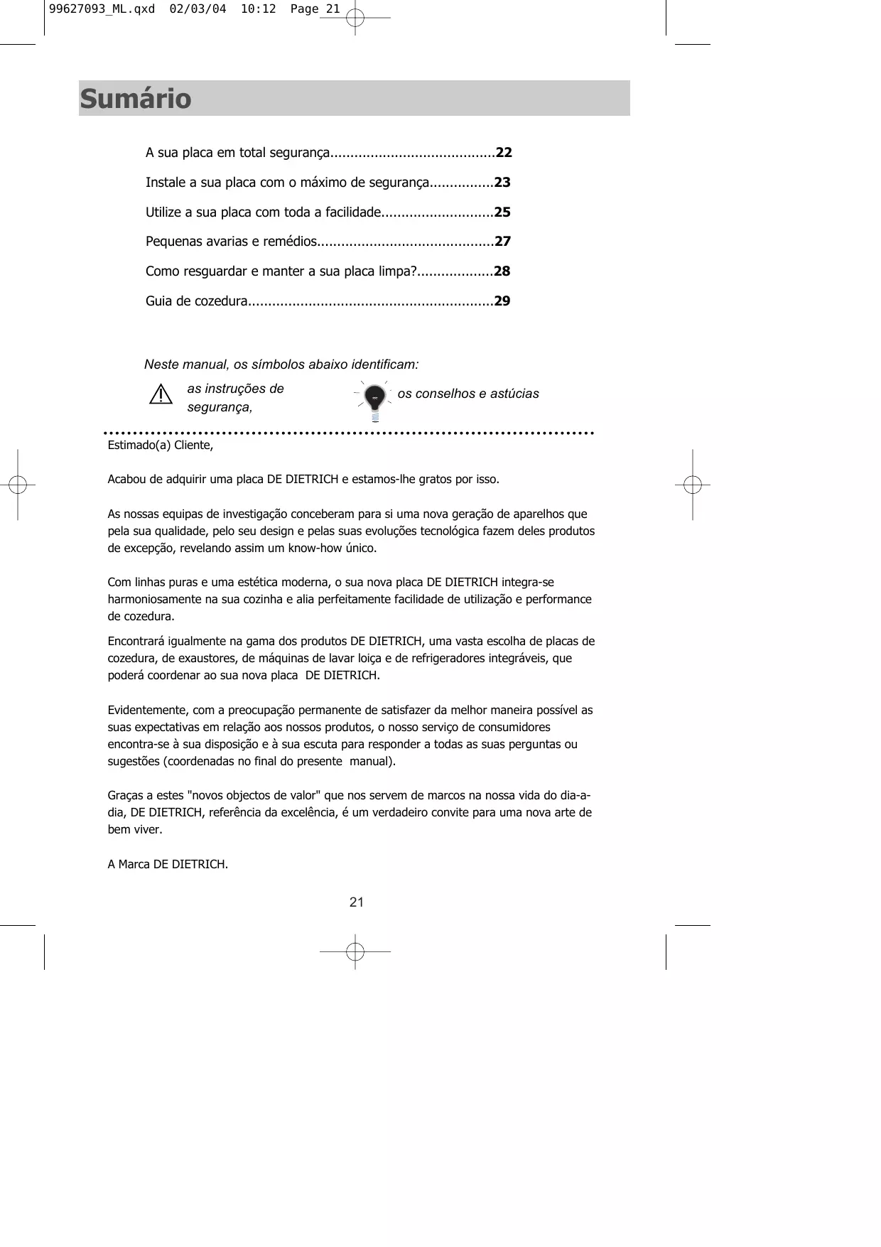 Estimado(a) Cliente, Acabou de adquirir uma placa DE DIETRICH e estamos-lhe gratos por isso. As nossas equipas de investigação conceberam para si uma nova geração de aparelhos que pela sua qualidade, pelo seu design e pelas suas evoluções tecnológica fazem deles produtos de excepção, revelando assim um know-how único. Com linhas puras e uma estética moderna, o sua nova placa DE DIETRICH integra-se harmoniosamente na sua cozinha e alia perfeitamente facilidade de utilização e performance de cozedura. Encontrará igualmente na gama dos produtos DE DIETRICH, uma vasta escolha de placas de cozedura, de exaustores, de máquinas de lavar loiça e de refrigeradores integráveis, que poderá coordenar ao sua nova placa DE DIETRICH. Evidentemente, com a preocupação permanente de satisfazer da melhor maneira possível as suas expectativas em relação aos nossos produtos, o nosso serviço de consumidores encontra-se à sua disposição e à sua escuta para responder a todas as suas perguntas ou sugestões (coordenadas no final do presente manual). Graças a estes "novos objectos de valor" que nos servem de marcos na nossa vida do dia-adia, DE DIETRICH, referência da excelência, é um verdadeiro convite para uma nova arte de bem viver. A Marca DE DIETRICH.