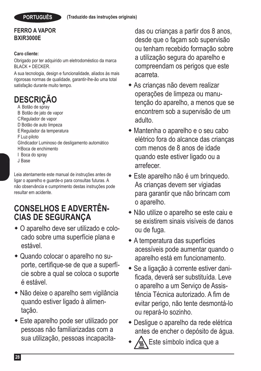 FERRO A VAPOR BXIR3000E Caro cliente: Obrigado por ter adquirido um eletrodoméstico da marca BLACK + DECKER. A sua tecnologia, design e funcionalidade, aliados às mais rigorosas normas de qualidade, garantir-lhe-ão uma total satisfação durante muito tempo.