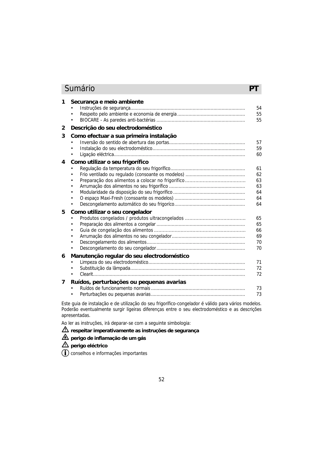 Este guia de instalação e de utilização do seu frigorífico-congelador é válido para vários modelos. Poderão eventualmente surgir ligeiras diferenças entre o seu electrodoméstico e as descrições apresentadas. Ao ler as instruções, irá deparar-se com a seguinte simbologia: respeitar imperativamente as instruções de segurança perigo de inflamação de um gás perigo eléctrico conselhos e informações importantes