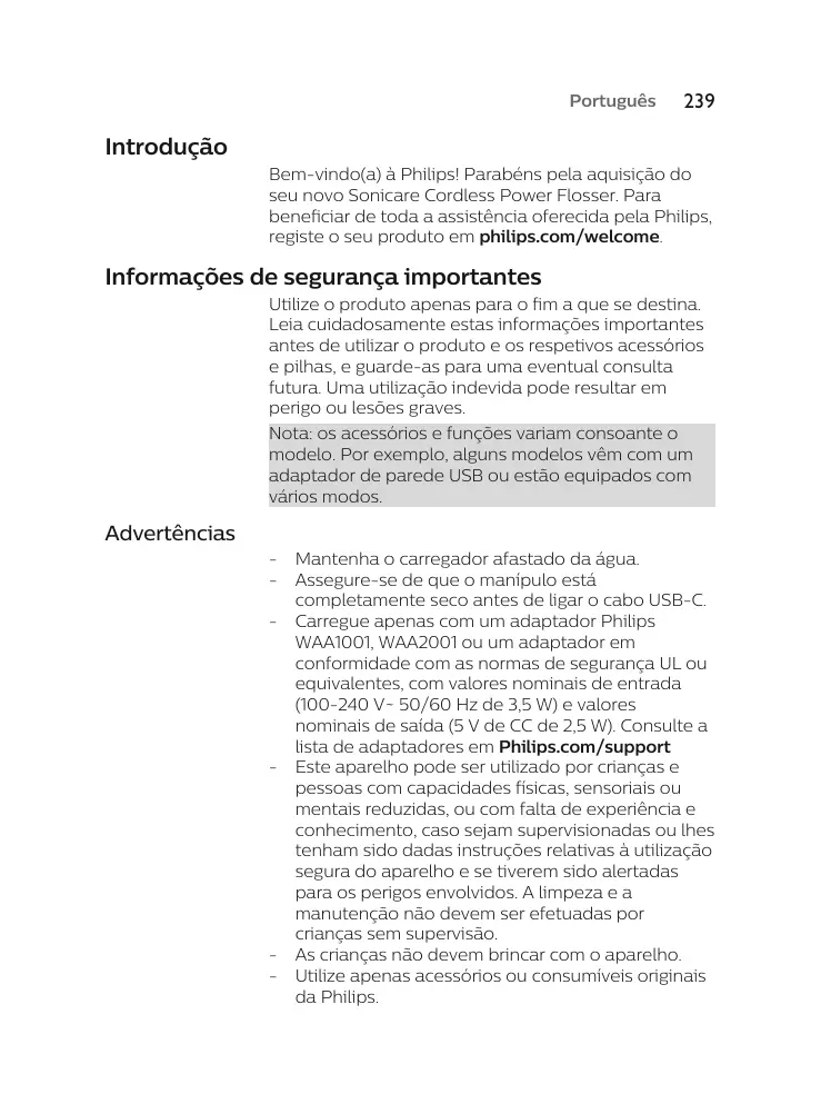 - 50/60 Hz / 3,5 W en entrée et 5 Vcc /2,5 W en sortie. Pour consulter la liste des adaptateurs, rendez-vous sur philips.com/support. Cet appareil peut être utilisé par des enfants, des personnes dont les capacités physiques, sensorielles ou intellectuelles sont réduites ou des personnes manquant d'expérience et de connaissances, à condition que ces enfants ou personnes soient sous surveillance ou qu'ils aient reçu des instructions quant à l'utilisation sécurisée de l'appareil et qu'ils aient pris connaissance des dangers encourus. Le nettoyage et l'entretien ne doivent pas être effectués par des enfants sans surveillance. Les enfants ne doivent pas jouer avec l'appareil.