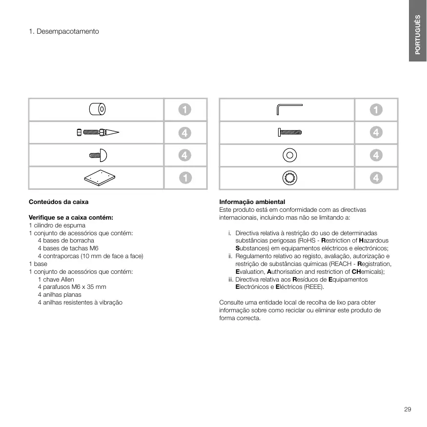 4 pieds en caoutchouc 4 pieds-pointes M6 4 écrous de blocage (10 mm) 1 support de sol 1 carton d’accessoires contenant : équipements électriques et électroniques, ii. l’enregistrement, l’évaluation, l’autorisation et la restriction des substances chimiques (REACH) iii l’élimination des déchets électriques et électroniques (WEEE). Consultez votre organisme local d’élimination des déchets pour des conseils sur la façon appropriée de recycler ou de jeter ce produit.