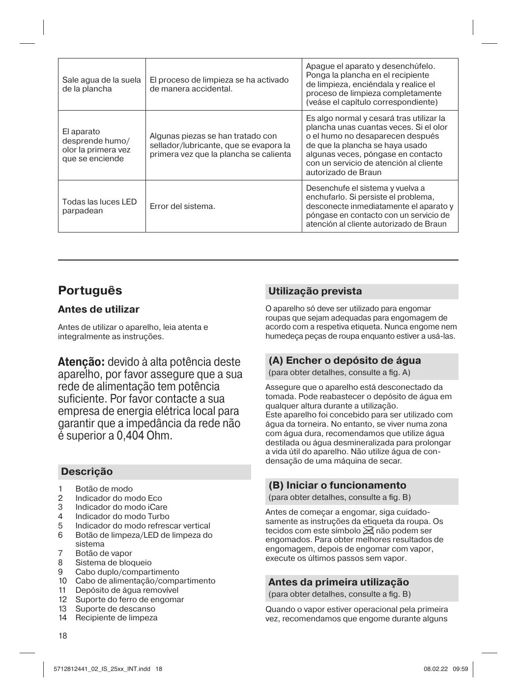 Isto é normal e deixará de ocorrer depois de o ferro ser utilizado algumas vezes. Se o fumo/odor persistir após o desligamento e o arrefecimento, contacte um Centro de Assistência ao Cliente Braun autorizado