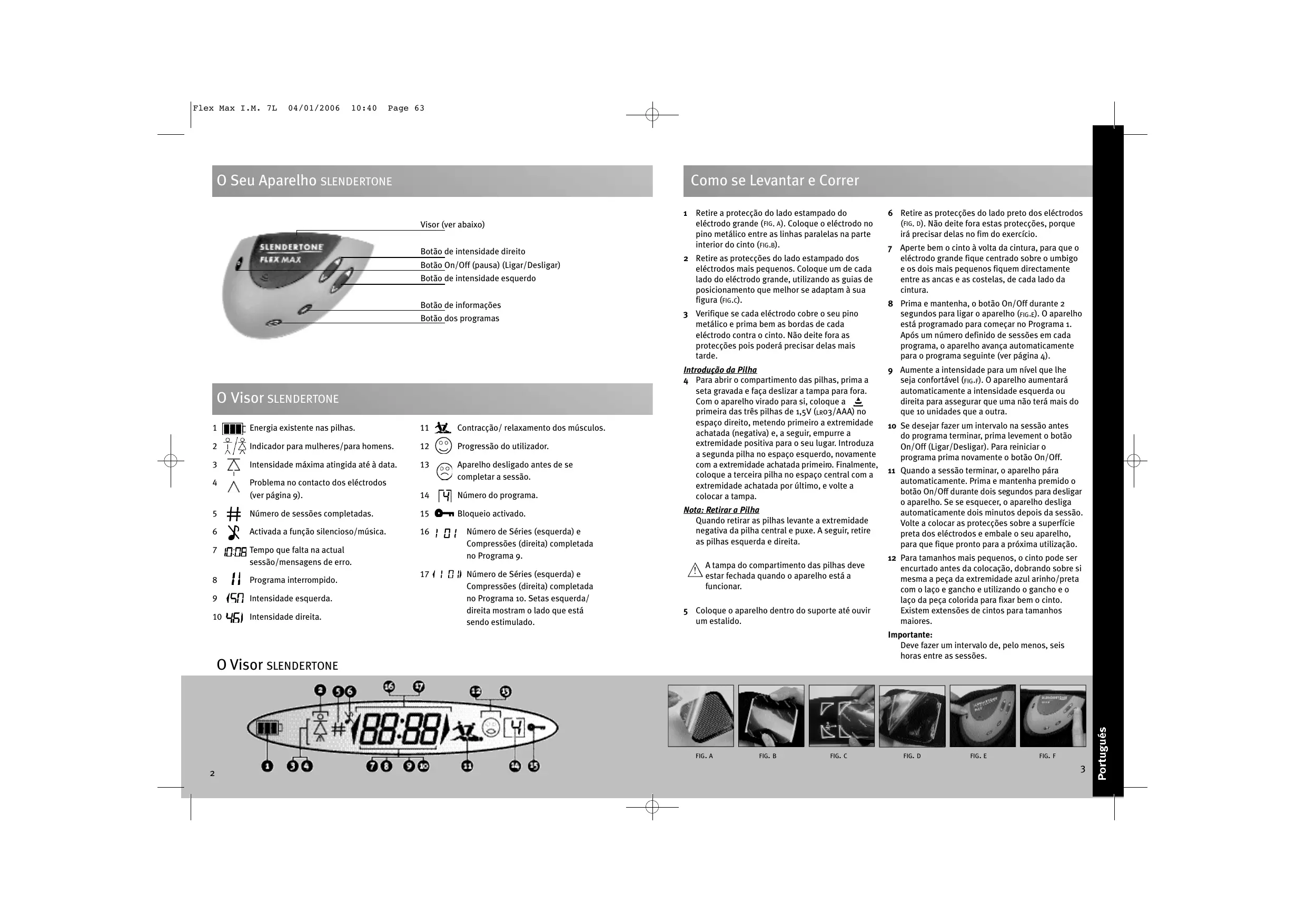 Número de Séries (esquerda) e Compressões (direita) completada no Programa 9. Número de Séries (esquerda) e Compressões (direita) completada no Programa 10. Setas esquerda/ direita mostram o lado que está sendo estimulado. 1 Retire a protecção do lado estampado do eléctrodo grande (FIG. A). Coloque o eléctrodo no pino metálico entre as linhas paralelas na parte interior do cinto (FIG.B). 2 Retire as protecções do lado estampado dos eléctrodos mais pequenos. Coloque um de cada lado do eléctrodo grande, utilizando as guias de posicionamento que melhor se adaptam à sua figura (FIG.C). 3 Verifique se cada eléctrodo cobre o seu pino metálico e prima bem as bordas de cada eléctrodo contra o cinto. Não deite fora as protecções pois poderá precisar delas mais tarde. Introdução da Pilha 4 Para abrir o compartimento das pilhas, prima a seta gravada e faça deslizar a tampa para fora. Com o aparelho virado para si, coloque a primeira das três pilhas de 1,5V (LR03/AAA) no espaço direito, metendo primeiro a extremidade achatada (negativa) e, a seguir, empurre a extremidade positiva para o seu lugar. Introduza a segunda pilha no espaço esquerdo, novamente com a extremidade achatada primeiro. Finalmente, coloque a terceira pilha no espaço central com a extremidade achatada por último, e volte a colocar a tampa. Nota: Retirar a Pilha Quando retirar as pilhas levante a extremidade negativa da pilha central e puxe. A seguir, retire as pilhas esquerda e direita. A tampa do compartimento das pilhas deve ! estar fechada quando o aparelho está a funcionar. 5 Coloque o aparelho dentro do suporte até ouvir um estalido. 7 Aperte bem o cinto à volta da cintura, para que o eléctrodo grande fique centrado sobre o umbigo e os dois mais pequenos fiquem directamente entre as ancas e as costelas, de cada lado da cintura. 8 Prima e mantenha, o botão On/Off durante 2 segundos para ligar o aparelho (FIG.E). O aparelho está programado para começar no Programa 1. Após um número definido de sessões em cada programa, o aparelho avança automaticamente para o programa seguinte (ver página 4). 9 Aumente a intensidade para um nível que lhe seja confortável (FIG.F). O aparelho aumentará automaticamente a intensidade esquerda ou direita para assegurar que uma não terá mais do que 10 unidades que a outra. 10 Se desejar fazer um intervalo na sessão antes do programa terminar, prima levement o botão On/Off (Ligar/Desligar). Para reiniciar o programa prima novamente o botão On/Off. 11 Quando a sessão terminar, o aparelho pára automaticamente. Prima e mantenha premido o botão On/Off durante dois segundos para desligar o aparelho. Se se esquecer, o aparelho desliga automaticamente dois minutos depois da sessão. Volte a colocar as protecções sobre a superfície preta dos eléctrodos e embale o seu aparelho, para que fique pronto para a próxima utilização. 12 Para tamanhos mais pequenos, o cinto pode ser encurtado antes da colocação, dobrando sobre si mesma a peça da extremidade azul arinho/preta com o laço e gancho e utilizando o gancho e o laço da peça colorida para fixar bem o cinto. Existem extensões de cintos para tamanhos maiores. Importante: Deve fazer um intervalo de, pelo menos, seis horas entre as sessões. O Visor SLENDERTONE FIG. A