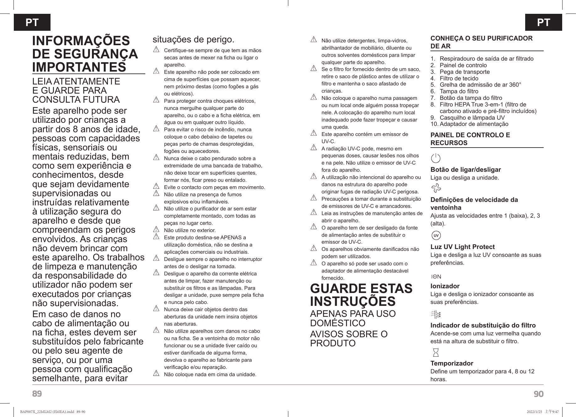 PT INFORMAÇÕES DE SEGURANÇA IMPORTANTES LEIA ATENTAMENTE E GUARDE PARA CONSULTA FUTURA Este aparelho pode ser utilizado por crianças a partir dos 8 anos de idade, pessoas com capacidades físicas, sensoriais ou mentais reduzidas, bem como sem experiência e conhecimentos, desde que sejam devidamente supervisionadas ou instruídas relativamente à utilização segura do aparelho e desde que compreendam os perigos envolvidos. As crianças não devem brincar com este aparelho. Os trabalhos de limpeza e manutenção da responsabilidade do utilizador não podem ser executados por crianças não supervisionadas. Em caso de danos no cabo de alimentação ou na ficha, estes devem ser substituídos pelo fabricante ou pelo seu agente de serviço, ou por uma pessoa com qualificação semelhante, para evitar 89 BAP007X_22MLM2 (EMEA).indd 89-90