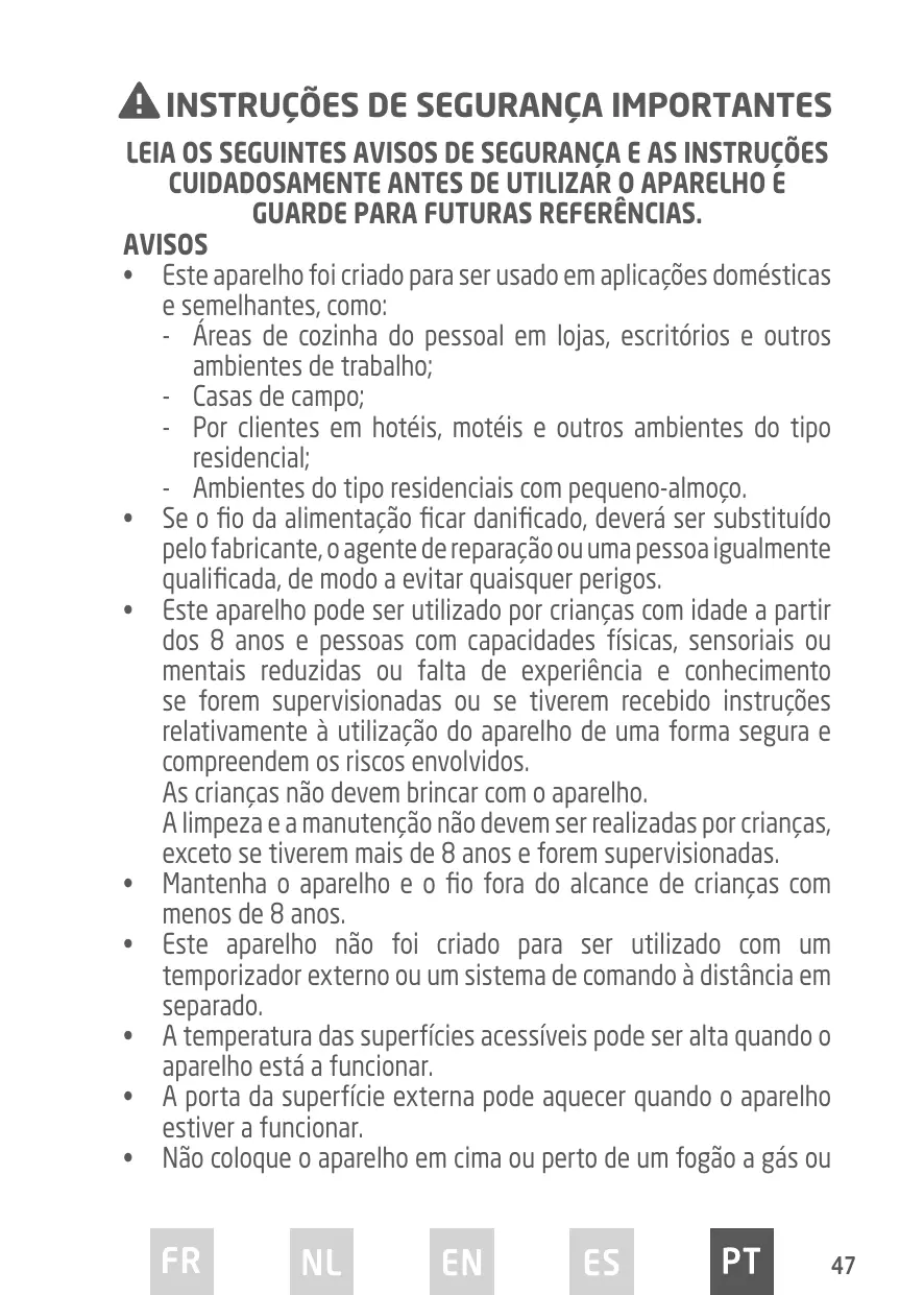 INSTRUÇÕES DE SEGURANÇA IMPORTANTES LEIA OS SEGUINTES AVISOS DE SEGURANÇA E AS INSTRUÇÕES CUIDADOSAMENTE ANTES DE UTILIZAR O APARELHO E GUARDE PARA FUTURAS REFERÊNCIAS. AVISOS • Este aparelho foi criado para ser usado em aplicações domésticas e semelhantes, como: - Áreas de cozinha do pessoal em lojas, escritórios e outros ambientes de trabalho; - Casas de campo; - Por clientes em hotéis, motéis e outros ambientes do tipo residencial; - Ambientes do tipo residenciais com pequeno-almoço. • Se o fio da alimentação ficar danificado, deverá ser substituído pelo fabricante, o agente de reparação ou uma pessoa igualmente qualificada, de modo a evitar quaisquer perigos. • Este aparelho pode ser utilizado por crianças com idade a partir dos 8 anos e pessoas com capacidades físicas, sensoriais ou mentais reduzidas ou falta de experiência e conhecimento se forem supervisionadas ou se tiverem recebido instruções relativamente à utilização do aparelho de uma forma segura e compreendem os riscos envolvidos. As crianças não devem brincar com o aparelho. A limpeza e a manutenção não devem ser realizadas por crianças, exceto se tiverem mais de 8 anos e forem supervisionadas. • Mantenha o aparelho e o fio fora do alcance de crianças com menos de 8 anos. • Este aparelho não foi criado para ser utilizado com um temporizador externo ou um sistema de comando à distância em separado. • A temperatura das superfícies acessíveis pode ser alta quando o aparelho está a funcionar. • A porta da superfície externa pode aquecer quando o aparelho estiver a funcionar. • Não coloque o aparelho em cima ou perto de um fogão a gás ou