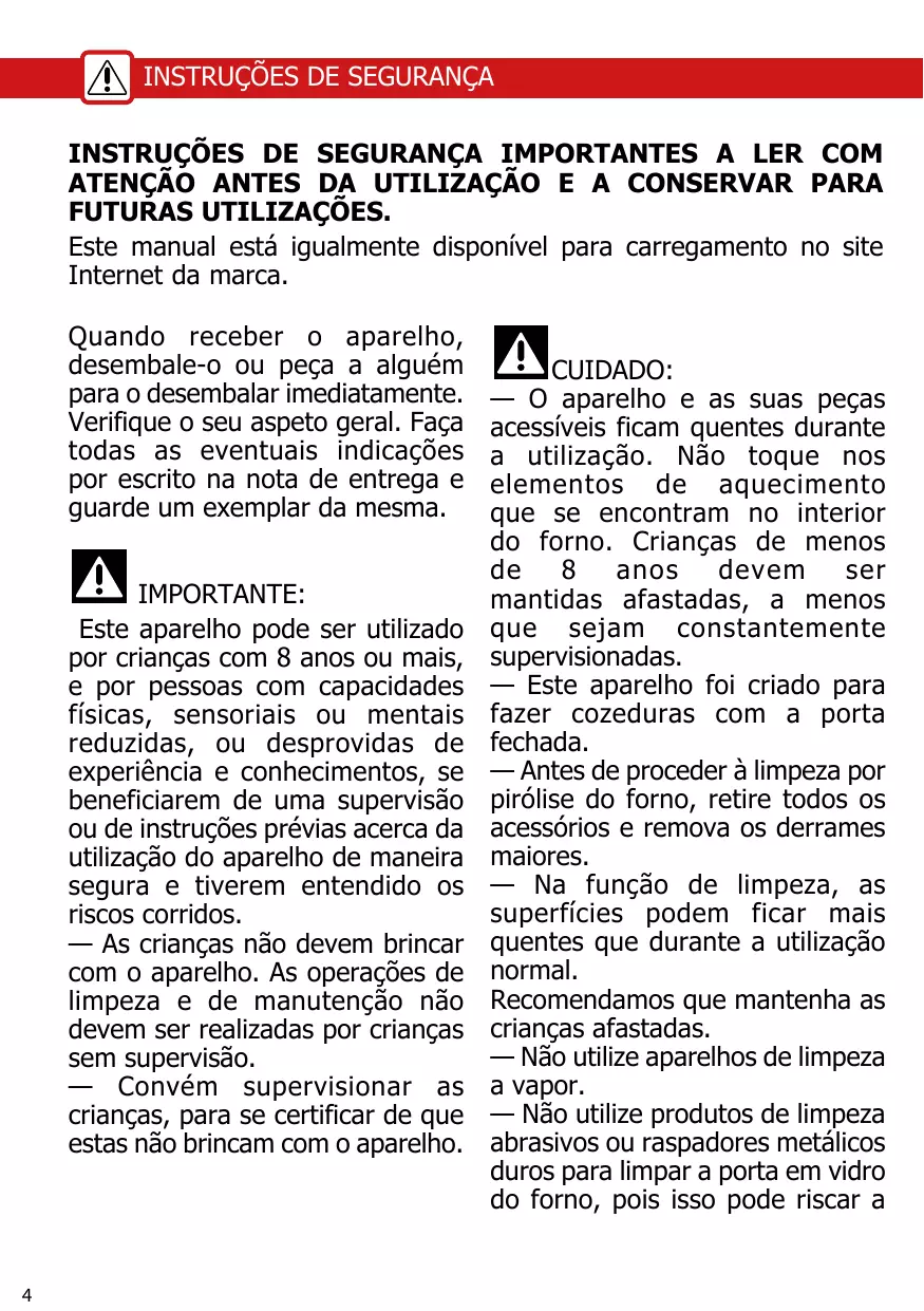 La función de guía de vapor 17 Mantenimiento de su aparato 18 Limpieza del interior y del exterior 20 Fallos y soluciones 22 Servicio postventa 23 — Este aparato ha sido diseñado con un ejemplar. para realizar cocciones con la puerta cerrada. — Antes de proceder a la IMPORTANTE: limpieza con función pirólisis del Este aparato se puede utilizar horno, retire todos los accesorios por niños de 8 años y más y por y elimine las salpicaduras personas con capacidades físicas, importantes. sensoriales o mentales reducidas — Durante una limpieza, las o carentes de la experiencia y superficies accesibles se del conocimiento si han podido calientan más que durante un uso beneficiar de una vigilancia o de normal. instrucciones previas sobre la Se recomienda alejar a los niños. utilización del aparato de forma — No utilice un aparato de segura y han comprendido los limpieza a vapor. riesgos incurridos. — No utilice productos de limpie— Los niños no deben jugar con za abrasivos ni estropajos metáliel aparato. Las operaciones de cos duros para limpiar la puerta limpieza y de mantenimiento no de cristal del horno, ya que podeben ser realizadas por niños drían rayar la superficie y provosin vigilancia. car la rotura del cristal. — Conviene vigilar a los niños para asegurarse de que no ADVERTENCIA: de la alimentación antes de — El aparato y sus partes cambiar la bombilla. Realice la accesibles se calientan intervención cuando el aparato se 4