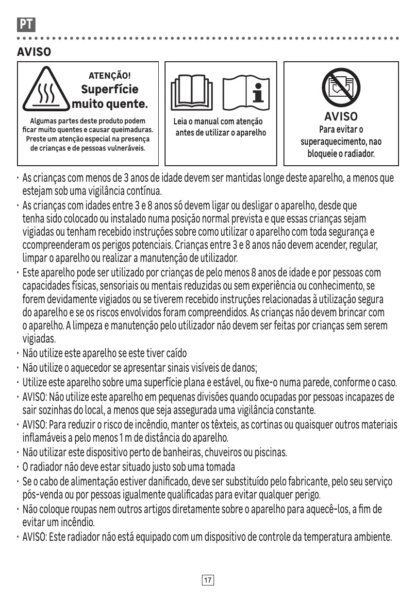 • Les enfants âgés entre 3 ans et 8 ans doivent uniquement mettre l'appareil en marche ou à l'arrêt, à condition que ce dernier ait été placé ou installé dans une position normale prévue et que ces enfants disposent d'une surveillance ou aient reçu des instructions quant à l'utilisation de l'appareil en toute sécurité et en comprennent bien les dangers potentiels. Les enfants âgés entre 3 ans et 8 ans ne doivent ni brancher, ni régler, ni nettoyer l'appareil, et ni réaliser l'entretien de l'utilisateur. • Cet appareil peut être utilisé par des enfants âgés d'au moins 8 ans et par des personnes ayant des capacités physiques, sensorielles ou mentales réduites ou dénuées d’expérience ou de connaissance, s'ils (si elles) sont correctement surveillé(e)s ou si des instructions relatives à l'utilisation de l'appareil en toute sécurité leur ont été données et si les risques encourus ont été appréhendés. Les enfants ne doivent pas jouer avec l’appareil. Le nettoyage et l'entretien par l'usager ne doivent pas être effectués par des enfants sans surveillance. • Ne pas utiliser cet appareil s'il est tombé • Ne pas utiliser l’appareil de chauffage si il présente des signes visibles de dommage; • Utiliser cet appareil sur une surface horizontale et stable, ou le fixer au mur, selon le cas. • AVERTISSEMENT: Ne pas utiliser cet appareil dans de petites pièces lorsqu'elles sont occupées par des personnes incapables de quitter la pièce par elles-mêmes, sauf si une surveillance constante est assurée. • AVERTISSEMENT: Pour réduire le risque d'incendie, garder les textiles, les rideaux ou tout autre matériau inflammable à une distance minimale de 1 m de l'appareil. • Ne pas utiliser cet appareil à proximité d'une baignoire, d'une douche, ou d'une piscine. • Le radiateur ne doit pas être situé immédiatement sous une prise de courant • Si le câble d’alimentation est endommagé, il doit être remplacé par le fabricant, son service aprèsvente ou des personnes de qualification similaire afin d’éviter un danger. • Ne mettez pas directement les vêtements et autres articles sur l'appareil pour les réchauffer afin d'éviter un incendie. 33