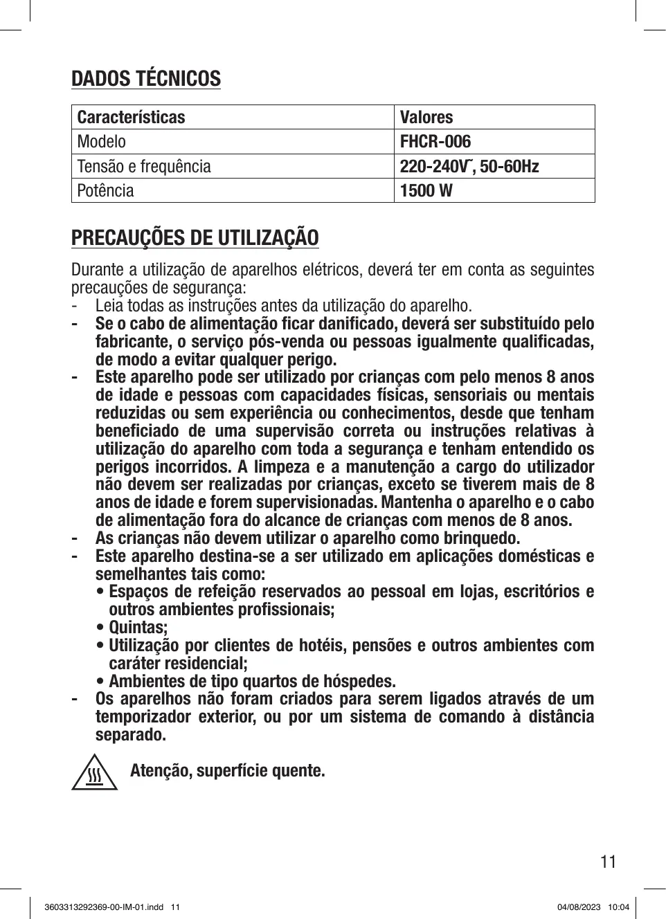 Características Modelo Tensão e frequência Potência Valores FHCR-006 220-240V˜, 50-60Hz 1500 W