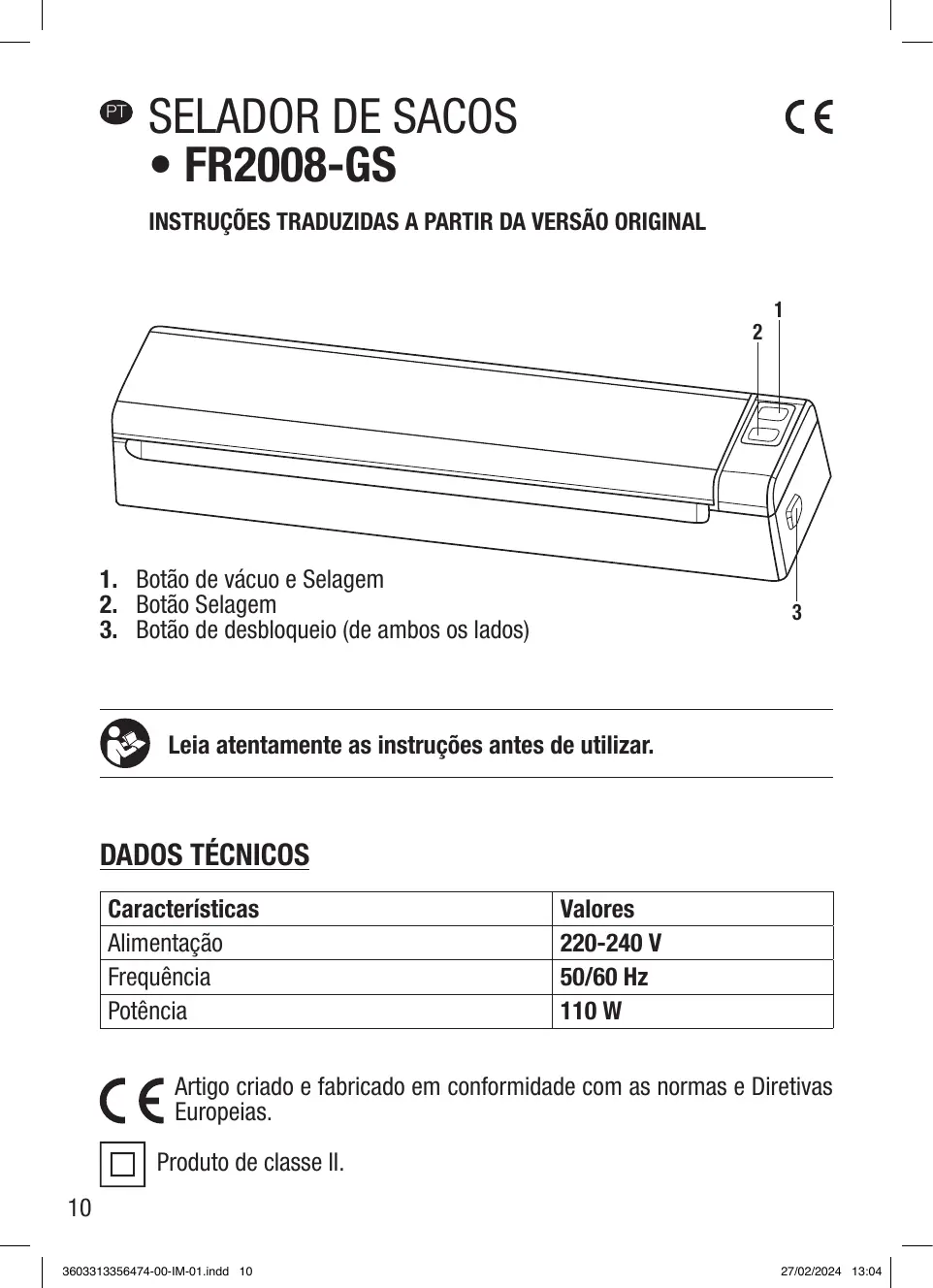 Características Alimentação Frequência Potência Valores 220-240 V 50/60 Hz 110 W Artigo criado e fabricado em conformidade com as normas e Diretivas Europeias. Produto de classe II. 3603313356474-00-IM-01.indd 10 27/02/2024 13:04