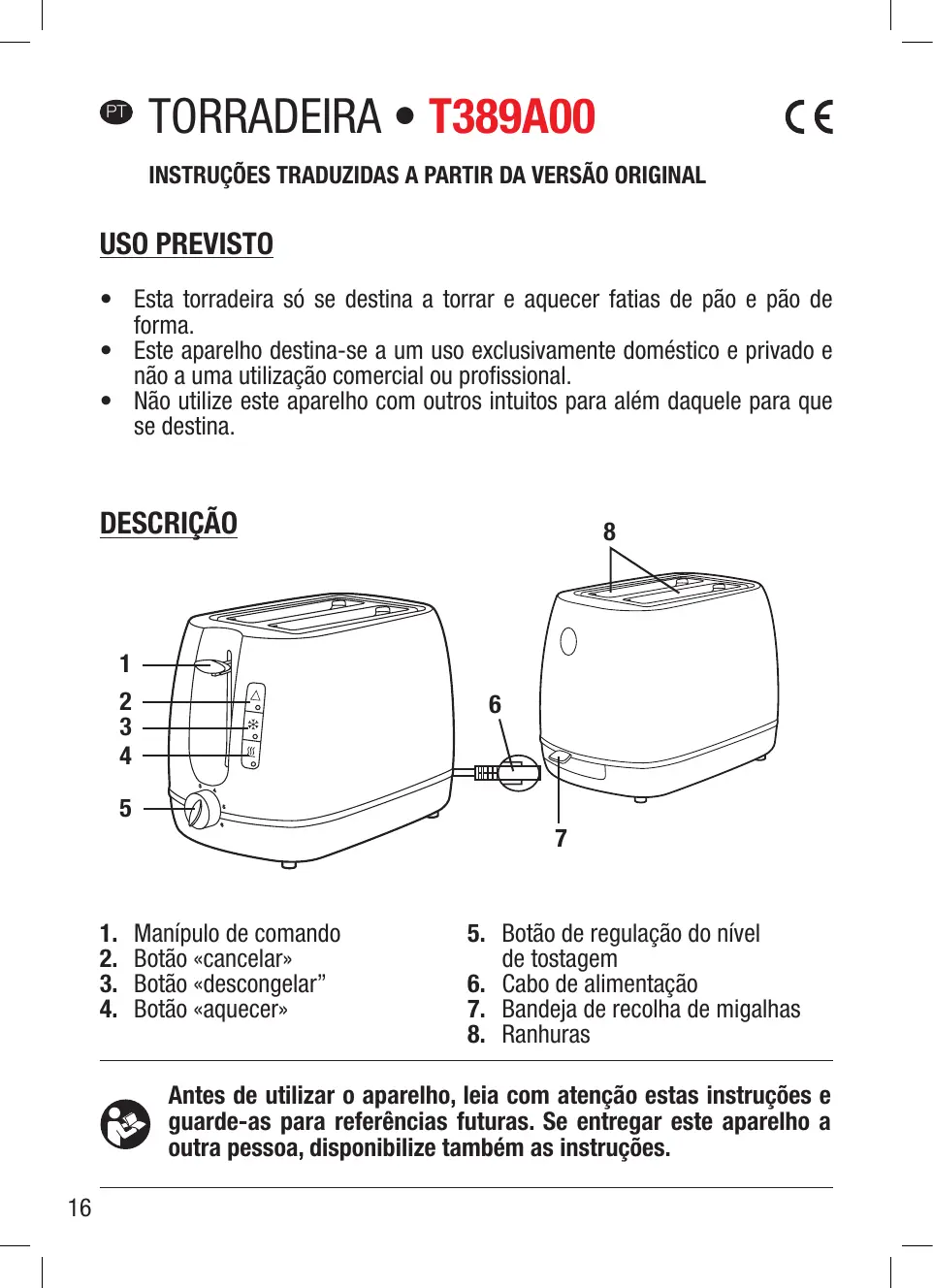 Nota: A torradeira permite descongelar e torrar pao.