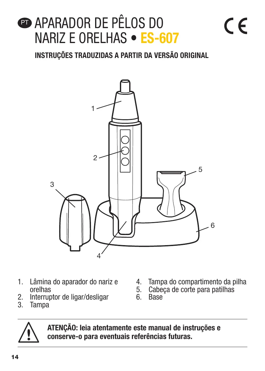 As informações seguintes dizem respeito à sua saúde e segurança. Tome conhecimento destas instruções antes de utilizar o produto. Este aparador foi criado apenas para uma utilização doméstica. As condições da garantia mudam no caso de utilização comercial. O aparelho foi criado para cortar apenas pêlos humanos. Não corte pêlos que não sejam naturais, ou pêlos de animais. Qualquer outra utilização para além da prevista dará origem à anulação da garantia. O aparador foi criado para aparar os pêlos do nariz e das orelhas, as patilhas, bem como os contornos da nuca. Não utilize este aparelho perto dos olhos ou para cortar cabelo comprido. Não utilize este aparelho no banho ou duche. Não coloque o produto dentro de água ou de qualquer outro líquido. Durante a sua utilização, não coloque o aparador em superfícies molhadas ou roupa. Não coloque o aparelho nem o guarde num local onde possa cair para dentro de água. Não utilize o aparelho se a cabeça de aparar estiver danificada. Risco de ferimentos. Nunca tente retirar os pêlos ou qualquer outro objeto estranho do interior do aparador utilizando objetos cortantes. Limpe após cada utilização. Este aparelho pode ser utilizado por crianças com, pelo menos, 8 anos de idade e pessoas com capacidades físicas, sensoriais ou mentais reduzidas ou sem experiência ou conhecimentos, desde que sejam supervisionadas ou ensinadas a usar o aparelho com toda a segurança e tenham entendido os perigos incorridos. As crianças não devem brincar com o aparelho. A limpeza e manutenção não devem ser feitas por crianças sem supervisão. Não insira a lâmina para além de 0,5 mm na orelha ou no nariz, para evitar lesões nos tímpanos ou na membrana mucosa do seu nariz. Certifique-se de que a cabeça está inserida corretamente antes de cada utilização.